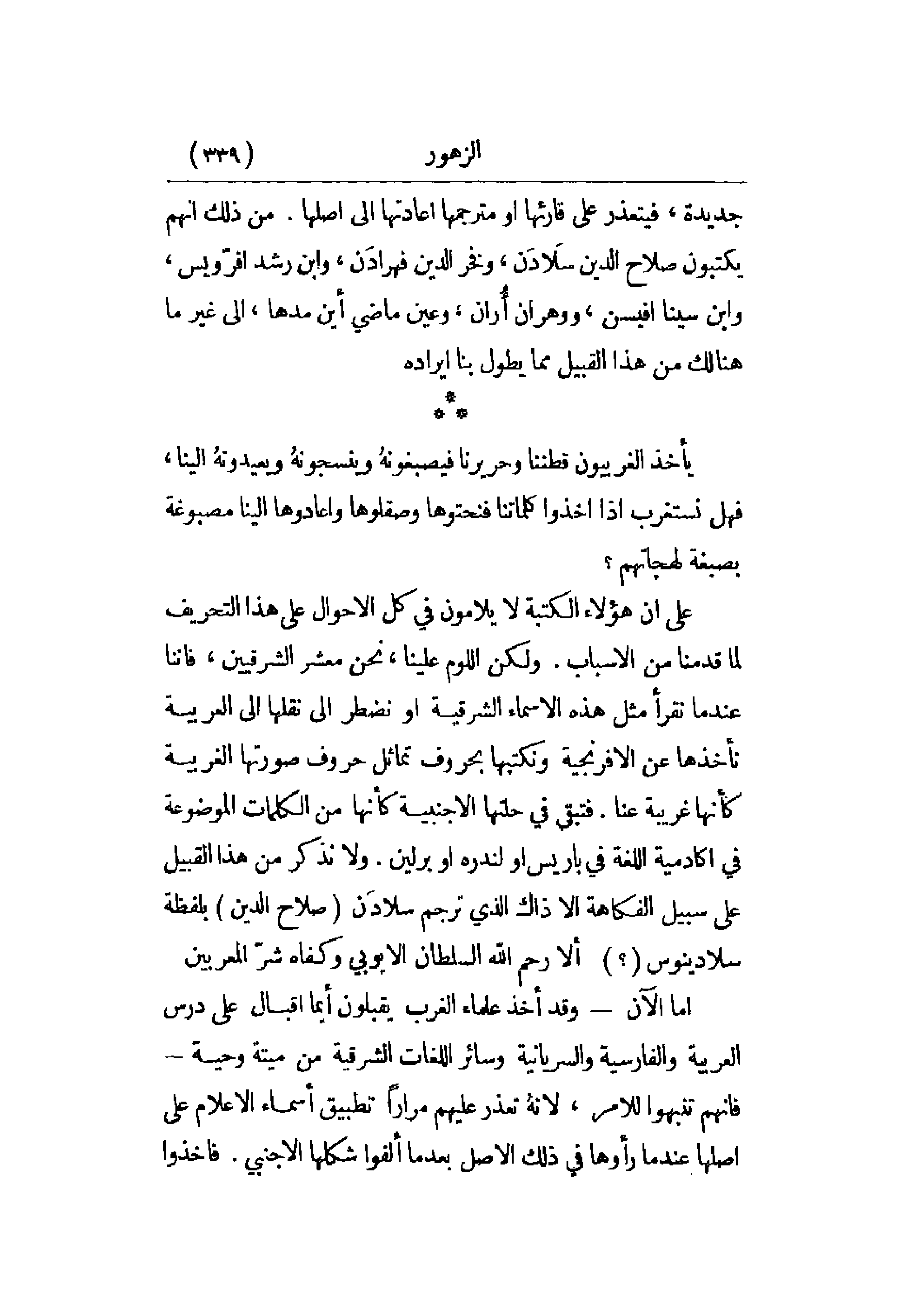 على أن هؤلاء الكتبة لا يلامون في كل الأحوال على هذا التحريف لما قدمنا من الأسباب. ولكن اللوم علينا، نحن معشر الشرقيين، فإننا عندما نقرأ مثل هذه الأسماء الشرقية أو نضطر إلى نقلها إلى العربية نأخذها عن الإفرنجية ونكتبها بحروف تماثل حروف صورتها الغربية كأنها غريبة عنا. فتبقى في حلتها الأجنبية كأنها من الكلمات الموضوعة في أكاديمية اللغة في باريس أو لندره أو برلين. ولا نذكر من هذا القبيل على سبيل الفكاهة إلا ذاك الذي ترجم سلادن (صلاح الدين) بلفظة سلادينوس (؟) ألا رحم الله السلطان الأيوبي وكفاه شر المعربين.