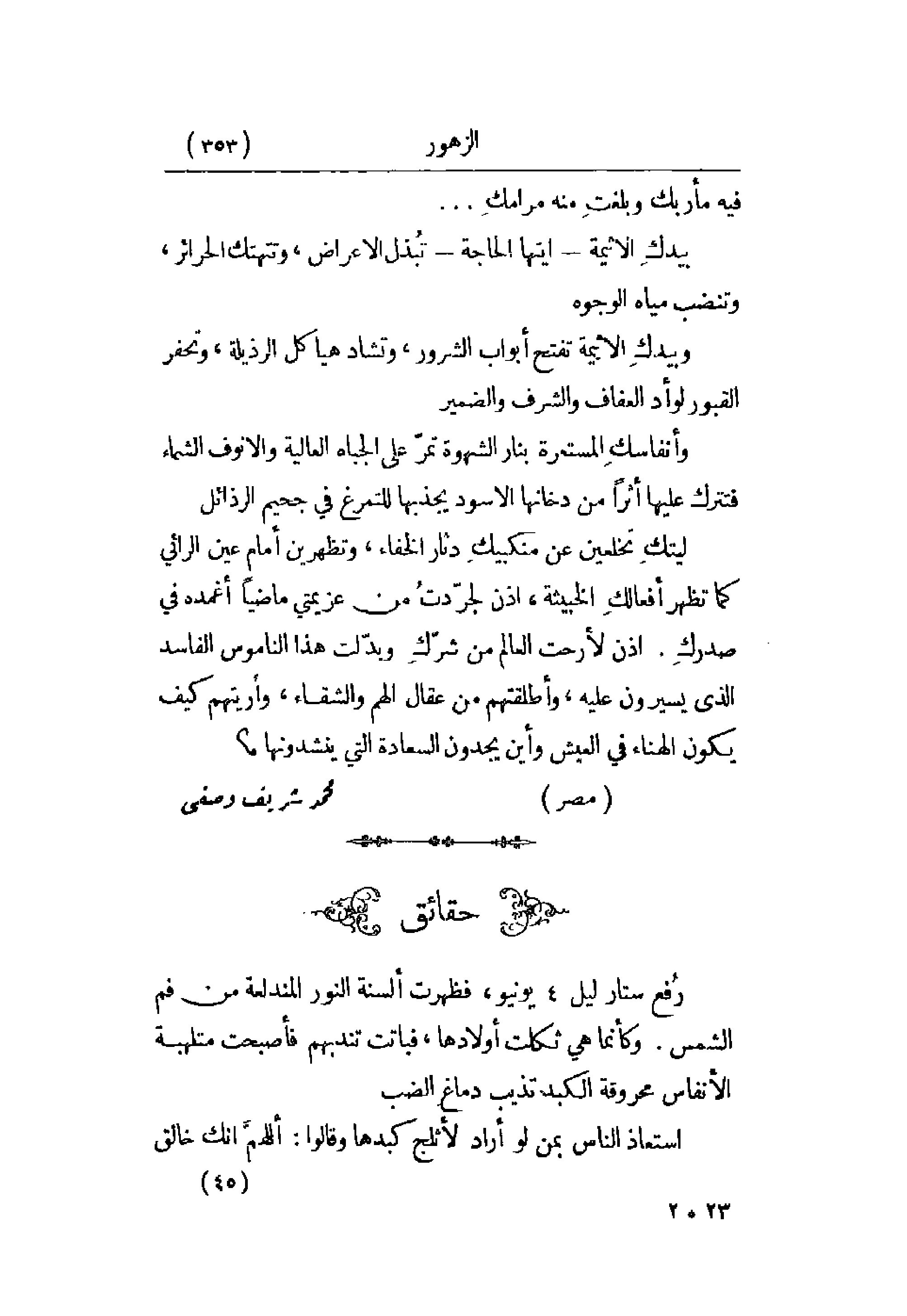 ليتك تخلعين عن منكبيك دثار الخفاء، وتظهرين أمام عين الرائي كما تظهر أفعالك الخبيثة، إذن لجردت من عزيمتي ماضياً أغمده في صدرك. إذن لأرحت العالم من شرك وبدلت هذا الناموس الفاسد الذي يسيرون عليه، وأطلقتهم من عقال الهم والشقاء، وأريتهم كيف يكون الهناء في العيش وأين يجدون السعادة التي ينشدونها.