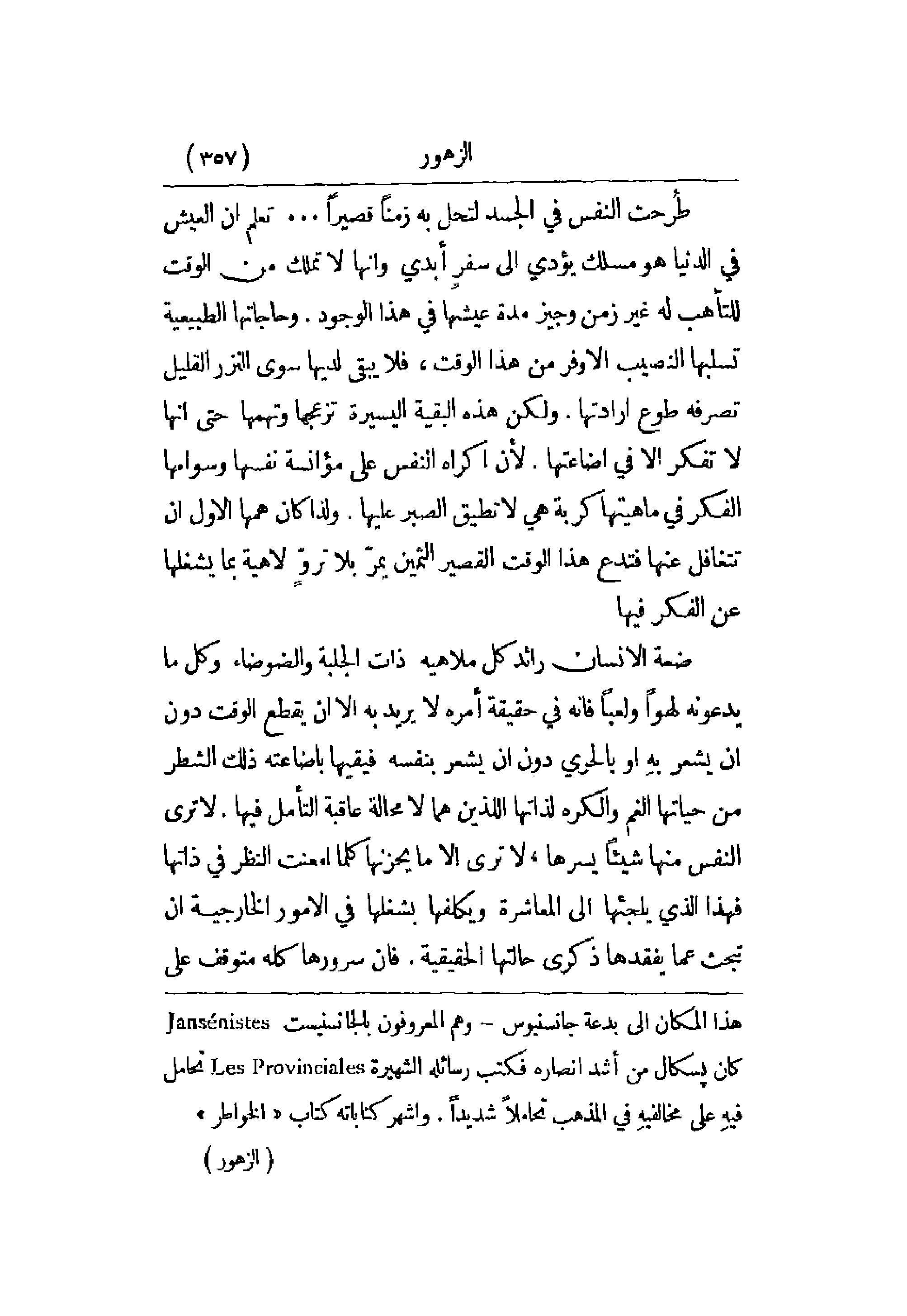 طرحت النفس في الجسد لتحل به زمناً قصيراً. . . تعلم أن العيس في الدنيا هو مسلك يؤدي إلى سفر أبدي وأنها لا تملك من الوقت للتأهب له غير زمن وجيز مدة عيشها في هذا الوجود. وحاجاتها الطبيعية تسلبها النصيب الأوفر من هذا الوقت، فلا يبقى لديها سوى النزر القليل تصرفه طوع إرادتها. ولكن هذه البقية اليسيرة تزعجها وتهمها حتى أنها لا تفكر إلا في إضاعتها. لأن إكراه النفس على مؤانسة نفسها وسوامها الفكر في ماهيتها كربة هي لا تطيق الصبر عليها. ولذا كان همها الأول ان تتغافل عنها فتدع هذا الوقت القصير الثمين يمر بلا ترو لاهية بما يشغلها عن الفكر فيها.