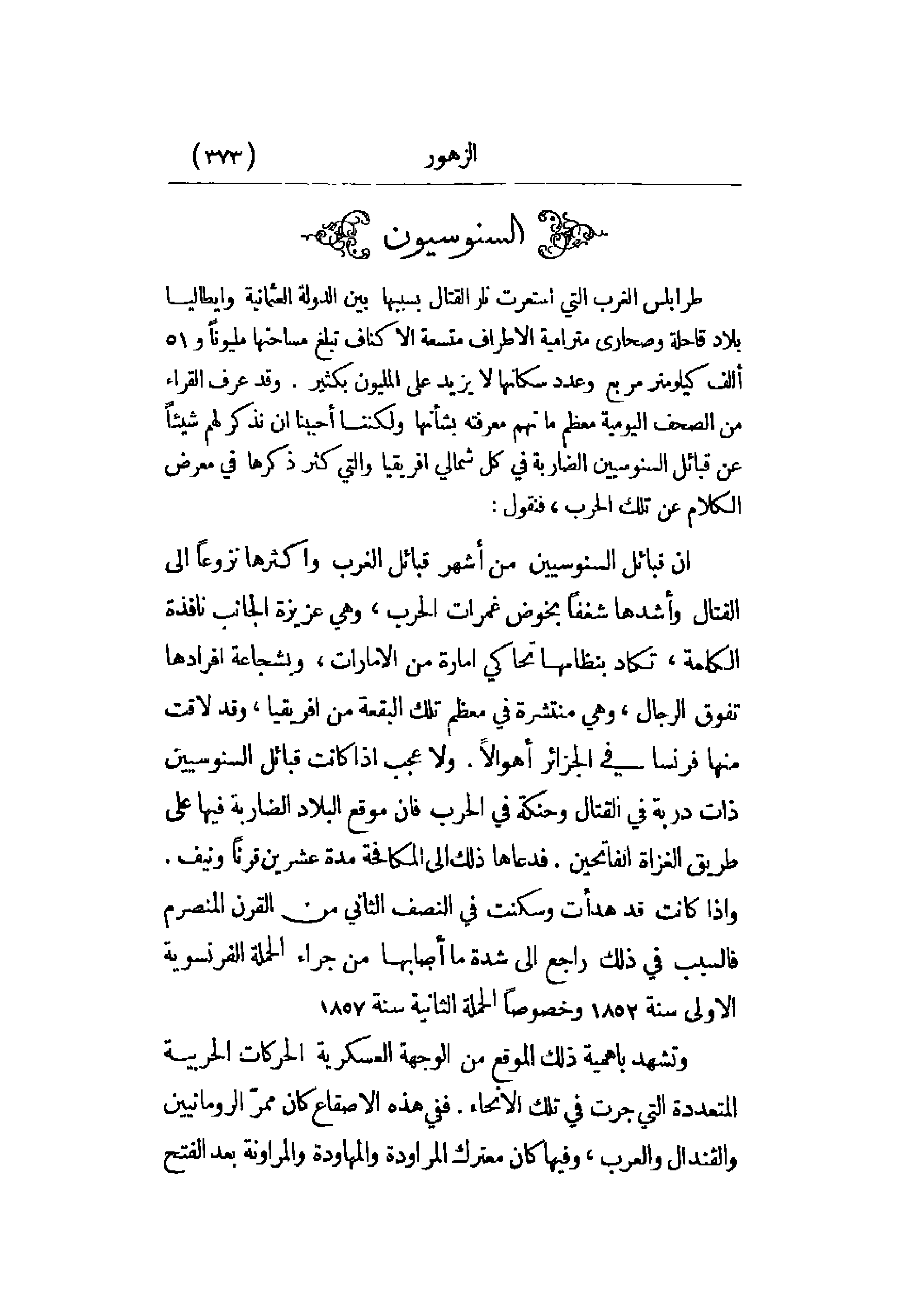 إن قبائل السنوسيين من أشهر قبائل الغرب وأكثرها نزوعاً إلى القتال وأشدها شغفاً بخوض غمرات الحرب، وهي عزيزة الجانب نافذة الكلمة، تكاد بنظامها تحاكي إمارة من الإمارات، وبشجاعة أفرادها تفوق الرجال، وهي منتشرة في معظم تلك البقعة من أفريقيا، وقد لاقت منها فرنسا في الجزائر أهوالاً. ولا عجب إذا كانت قبائل السنوسيين ذات دربة في القتال وحنكة في الحرب فإن موقع البلاد الضاربة فيها على طريق الغزاة الفاتحين. فدعاها ذلك إلى المكافحة مدة عشرين قرناً ونيف. وإذا كانت قد هدأت وسكنت في النصف الثاني من القرن المنصرم فالسبب في ذلك راجع إلى شدة ما أصابها من جراء الحملة الفرنسوية الأولى سنة 1852 وخصوصاً الحملة الثانية سنة 1857.