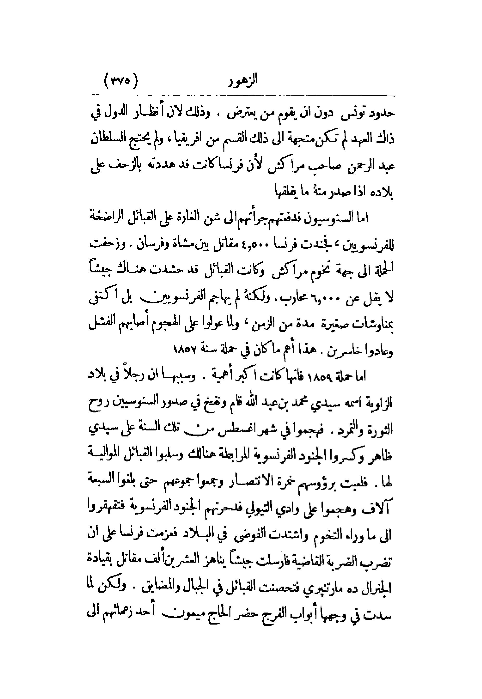 حدود تونس دون أن يقوم من يعترض. وذلك لأن أنظار الدول في ذاك العهد لم تكن متجهة إلى ذلك القسم من أفريقيا، ولم يحتج السلطان عبد الرحمن صاحب مراكش لأن فرنسا كانت قد هددته بالزحف على بلاده إذا صدر منه ما يقلقها.