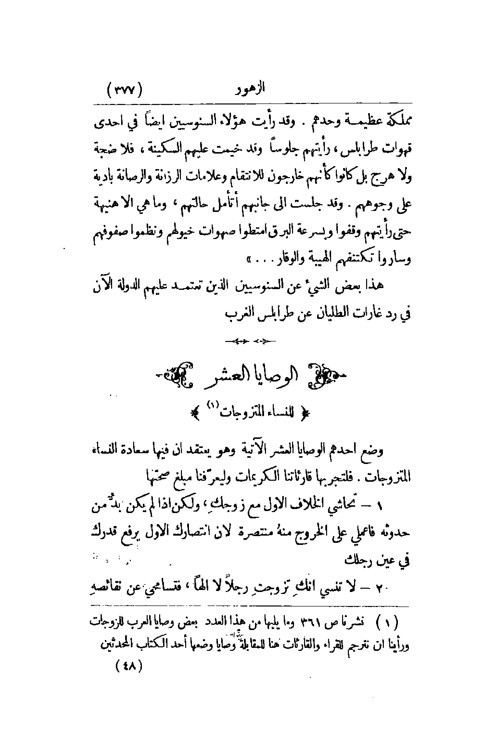 مملكة عظيمة وحدهم. وقد رأيت هؤلاء السنوسيين أيضاً في إحدى قهوات طرابلسن رأيتهم جلوساً وقد خيمت عليهم السكينة، فلا ضجة ولا هرج بل كانوا كأنهم خارجون للانتقام وعلامات الرزانة والرصانة بادية على وجوههم. وقد جلست إلى جانبهم أتأمل حالتهم، وما هي إلا هنيهة حتى رأيتهم وقفوا وبسرعة البرق امتطوا صهوات خيولهم ونظموا صفوفهم وساروا تكتنفهم الهيبة والوقار. . . .