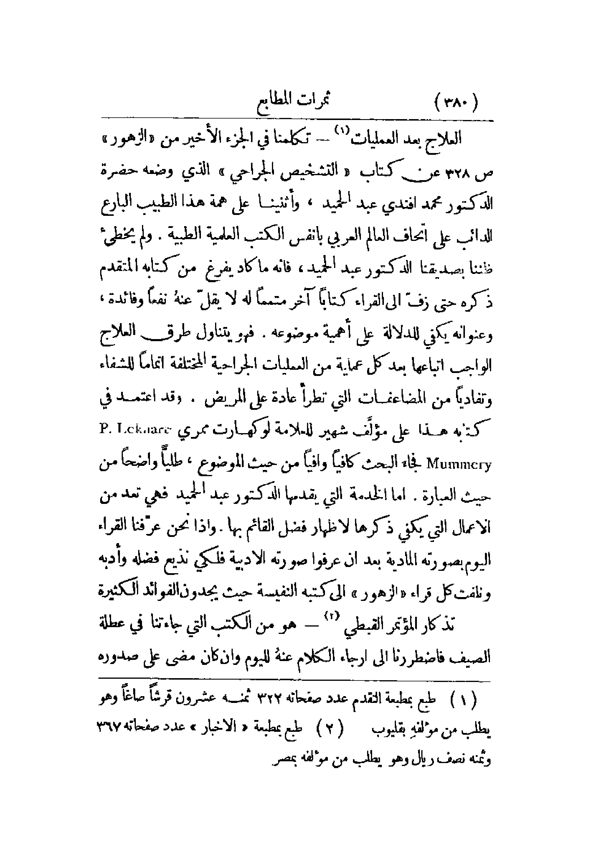 العلاج بعد العمليات - تكلمنا في الجزء الأخير من الزهور ص 328 عن كتاب التشخيص الجراحي الذي وضعه حضرة الدكتور محمد أفندي عبد الحميد، وأثنينا على همة هذا الطبيب البارع الدائب على إتحاف العالم العربي بأنفس الكتب العلمية الطبية. ولم يخطئ ظننا بصديقنا الدكتور عبد الحميد، فإنه ما كاد يفرغ من كتابه المتقدم ذكره حتى زف إلى القراء كتاباً آخر متمماً له لا يقل عنه نفعاً وفائدة، وعنوانه يكفي للدلالة على أهمية موضوعه. فهو يتناول طرق العلاج الواجب اتباعها بعد كل عملية من العمليات الجراحية المختلفة إتماماً للشفاء وتفادياً من المضاعفات التي تطرأ عادةً على المريض. وقد اعتمد في كتابه هذا على مؤلف شهير للعلامة لوكهارت ممري فجاء البحث كافياً وافياً من حيث الموضوع، طلياً واضحاً من حيث العبارة. أما الخدمة التي يقدمها الدكتور عبد الحميد فهي تعد من الأعمال التي يكفي ذكرها لإظهار فضل القائم بها. وإذا نحن عرفنا القراء اليوم بصورته المادية بعد أن عرفوا صورته الأدبية فلكي نذيع فضله وأدبه ونلفت كل قراء الزهور إلى كتبه النفيسة حيث يجدون الفوائد الكثيرة.