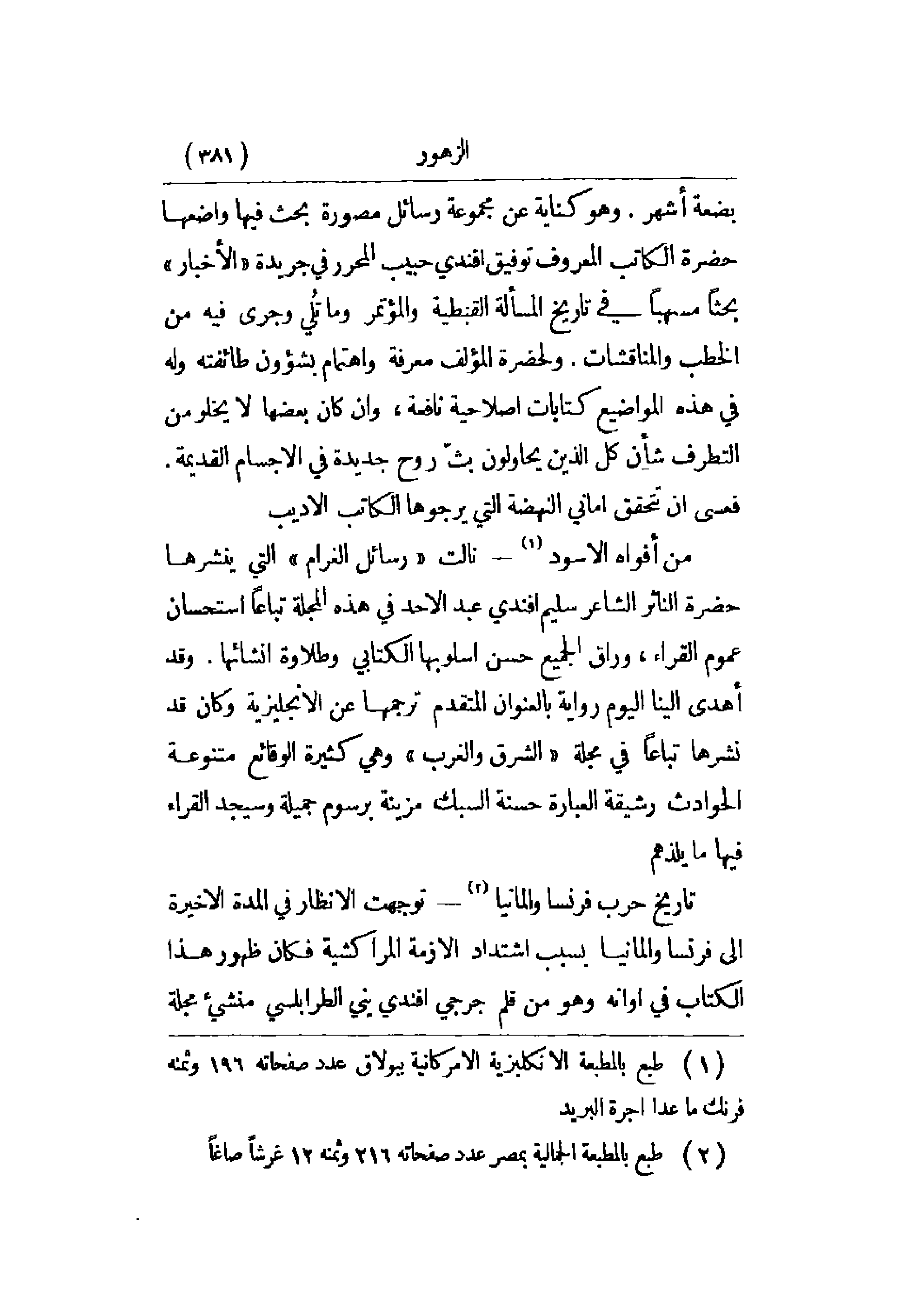 من أفواه الأسود - نالت رسائل الغرام التي ينشرها حضرة الناثر الشاعر سليم أفندي عبد الأحد في هذه المجلة تباعاً استحسان عموم القراء، وراق الجميع حسن أسلوبها الكتابي وطلاوة إنشائها. وقد أهدى إلينا اليوم رواية بالعنوان المتقدم ترجمها عن الإنجليزية وكان قد نشرها تباعاً في مجلة الشرق والغرب وهي كثيرة الوقائع متنوعة الحوادث رشيقة العبارة حسنة السبك مزينة برسوم جميلة وسيجد القراء فيها ما يلذهم.