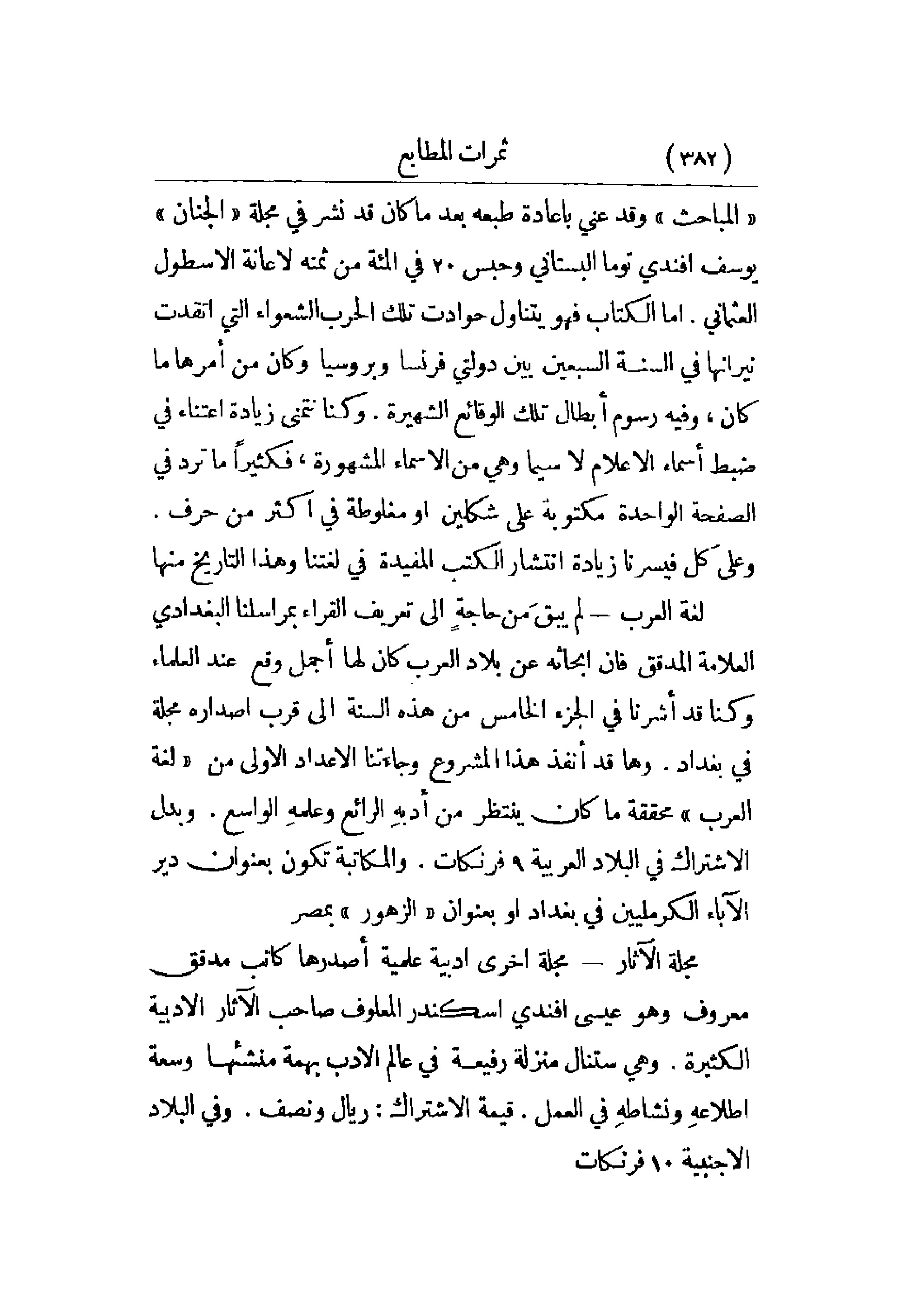المباحث وقد عني بإعادة طبعه بعد ما كان قد نشر فيم جلة الجنان يوسف أفندي توما البستاني وجبس 20 في المئة من ثمنه لإعانة الأسطول العثماني. أما الكتاب فهو يتناول حوادث تلك الحرب الشعواء التي اتقدت نيرانها في السنة السبعين بين دولتي فرنسا وبروسيا وكان من أمرها ما كان، وفيه رسوم أبطال تلك الوقائع الشهيرة. وكنا نتمنى زيادة اعتناء في ضبط أسماء الأعلام لاسيما وهي من الأسماء المشهورة، فكثيراً ما ترد في الصفحة الواحدة مكتوبة على شكلين أو مغلوطة في أكثر من حرف. وعلى كل فيسرنا زيادة انتشار الكتب المفيدة في لغتنا وهذا التاريخ منها.