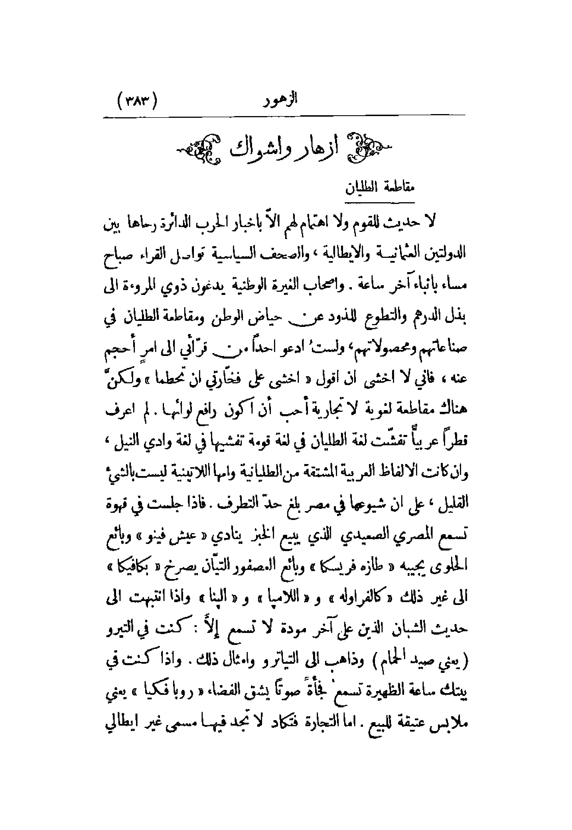 لا حديث للقوم واهتما لهم إلا بأخبار الحرب الدائرة رحاها بين الدولتين العثمانية والإيطالية، والصحف السياسية تواصل القراء صباح مساء بأنباء آخر ساعة. وأصحاب الغيرة الوطنية يدعون ذوي المروءة إلى بذل الدرهم والتطوع للذود عن حياض الوطن ومقاطعة الطليان في صناعاتهم ومحصولاتهم، ولست أدعو أحداً من قرائي إلى أمرٍ أحجم عنه، فإني لا أخشى أن أقول أخشى على فخارتي أن تحطما ولكن هناك مقاطعة لغوية لا تجارية أحب أن أكون رافع لوائها. لم أعرف قطراً عربياً تفشت لغة الطليان في لغة قومه تفشيها في لغة وادي النيل، وإن كانت الألفاظ العربية المشتقة من الطليانية وأمها اللاتينية ليست بالشيء القليل، على أن شيوعها في مصر بلغ التطرف. فإذا جلست في قهوة تسمع المصري الصعيدي الذي يبيع الخبز ينادي عيش فينو وبائع الحلوى يجيبه طازة فريسكا وبائع العصفور التيان يصرخ بكافيكا إلى غير ذلك كالفراولة واللامبا والبنا وإذا انتبهت إلى حديث الشبان الذين على آخر مودة لا تسمع إلا: كنت في التيرو (يعني صيد الحمام) وذاهب إلى التياترو وأمثال ذلك. وإذا كنت في بيتك ساعة الظهيرة تسمع فجأة صوتاً يشق الفضاء روبافكيا يعني ملابس عتيقة للبيع. أما التجارة فتكاد لا تجد فيها مسمى غير إيطالي