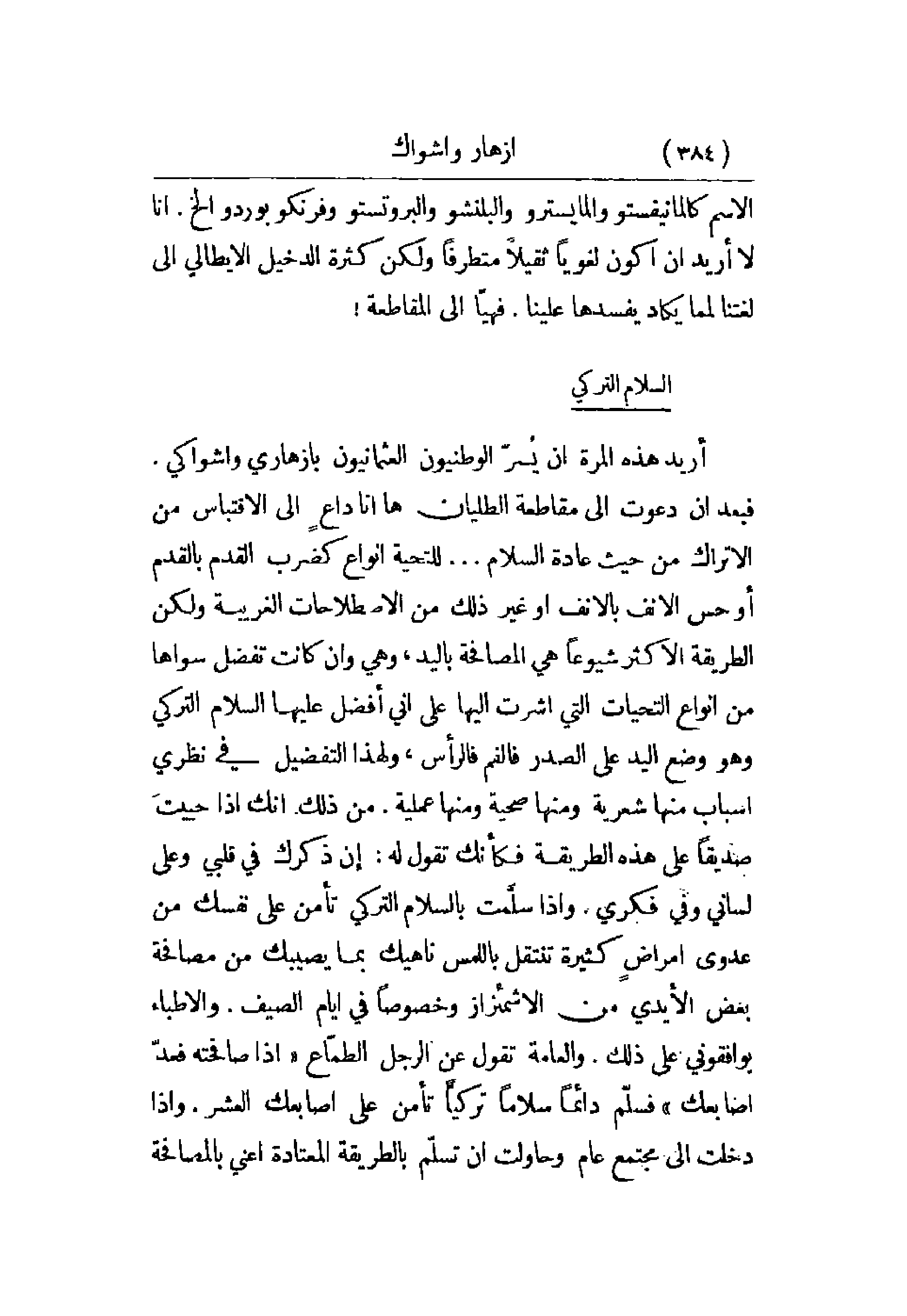 أريد هذه المرة أن يسر الوطنيون العثمانيون بأزهاري وأشواكي. فبعد أن دعوت إلى مقاطعة الطليان ها أنا داع إلى الاقتباس من الأتراك من حيث عادة السلام. . . . للتحية أنواع كضرب القدم بالقدم أو حس الأنف بالأنف أو غير ذلك من الاصطلاحات الغريبة ولكن الطريقة الأكثر شيوعاً هي المصافحة باليد، وهي وإن كانت تفضل سواها من أنواع التحيات التي أشرت إليها على أني أفضل عليها السلام التركي وهو وضع اليد على الصدر فالفم فالرأس، ولهذا التفضيل في نظري أسباب منها شعرية ومنها صحية ومنها