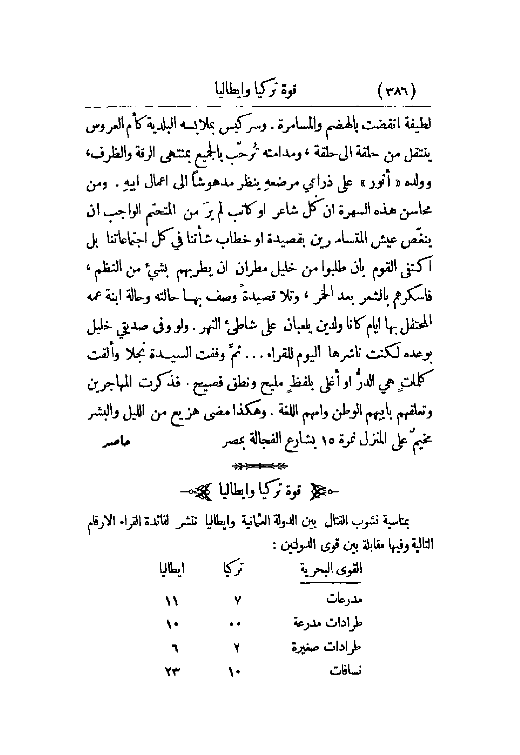 بمناسبة نشوب القتال بين الدولة العثمانية وإيطاليا ننشر لفائدة القراء الأرقام التالية وفيها مقابلة بين قوى الدولتين:
