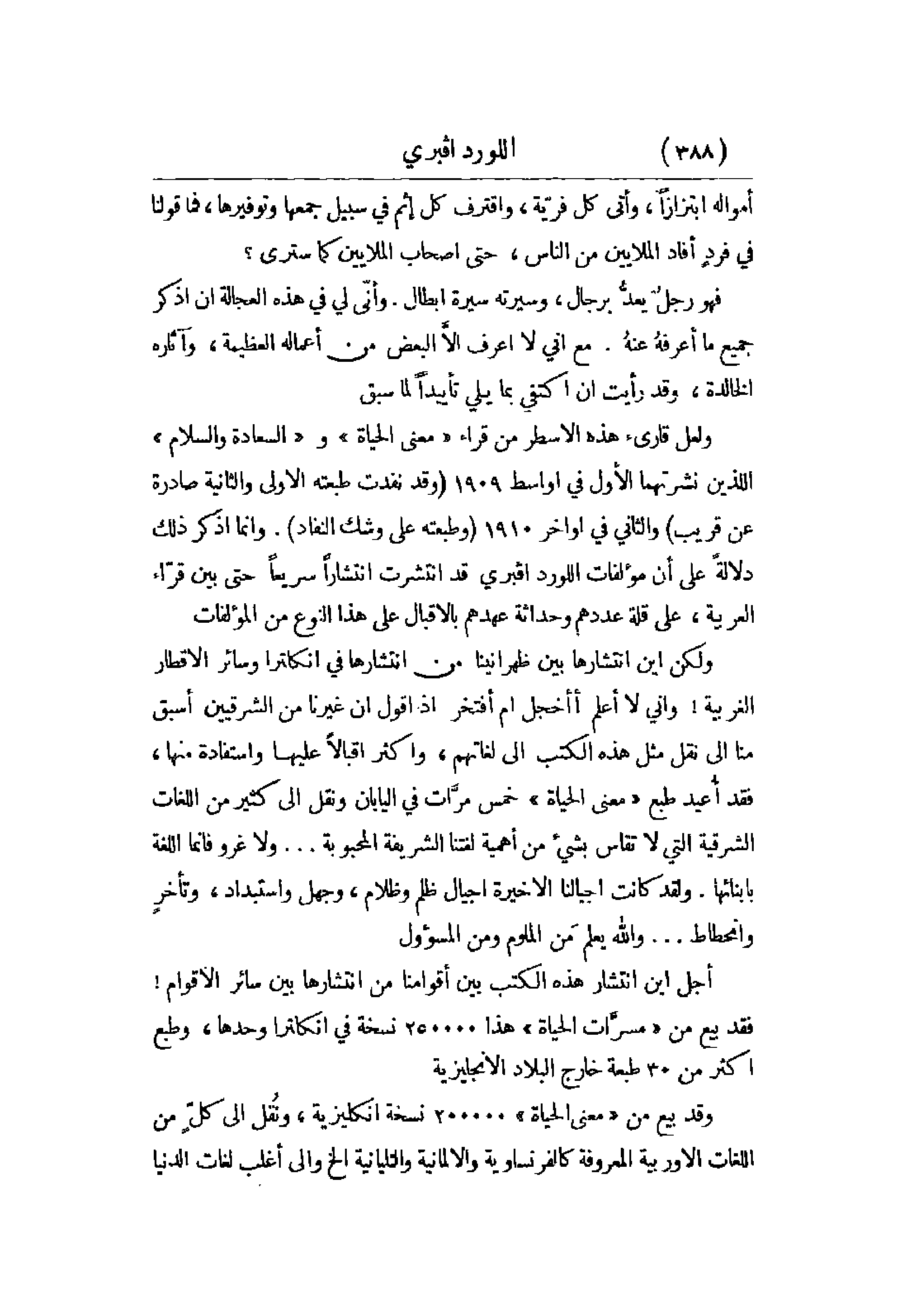 ولكن أين انتشارها بين ظهرانينا من انتشارها في إنكلترا وسائر الأقطار العربية! وإني لا اعلم أأخجل أم أفتخر إذ أقول إن غيرنا من الشرقيين أسبق منا إلى نقل مثل هذه الكتب إلى لغاتهم، وأكثر إقبالاً عليها واستفادة منها، فقد أعيد طبع معنى الحياة خمس مرات في اليابان ونقل إلى كثير من اللغات الشرقية التي لا تقاس بشيء من أهمية لغتنا الشريفة المحبوبة. . . ولا غرو فإنما اللغة بأبنائها. ولقد كانت أجيالنا الأخيرة أجيال ظلم وظلام، وجعل واستبداد، وتأخر وانحطاط. . . والله يعلم من الملوم ومن المسؤول.