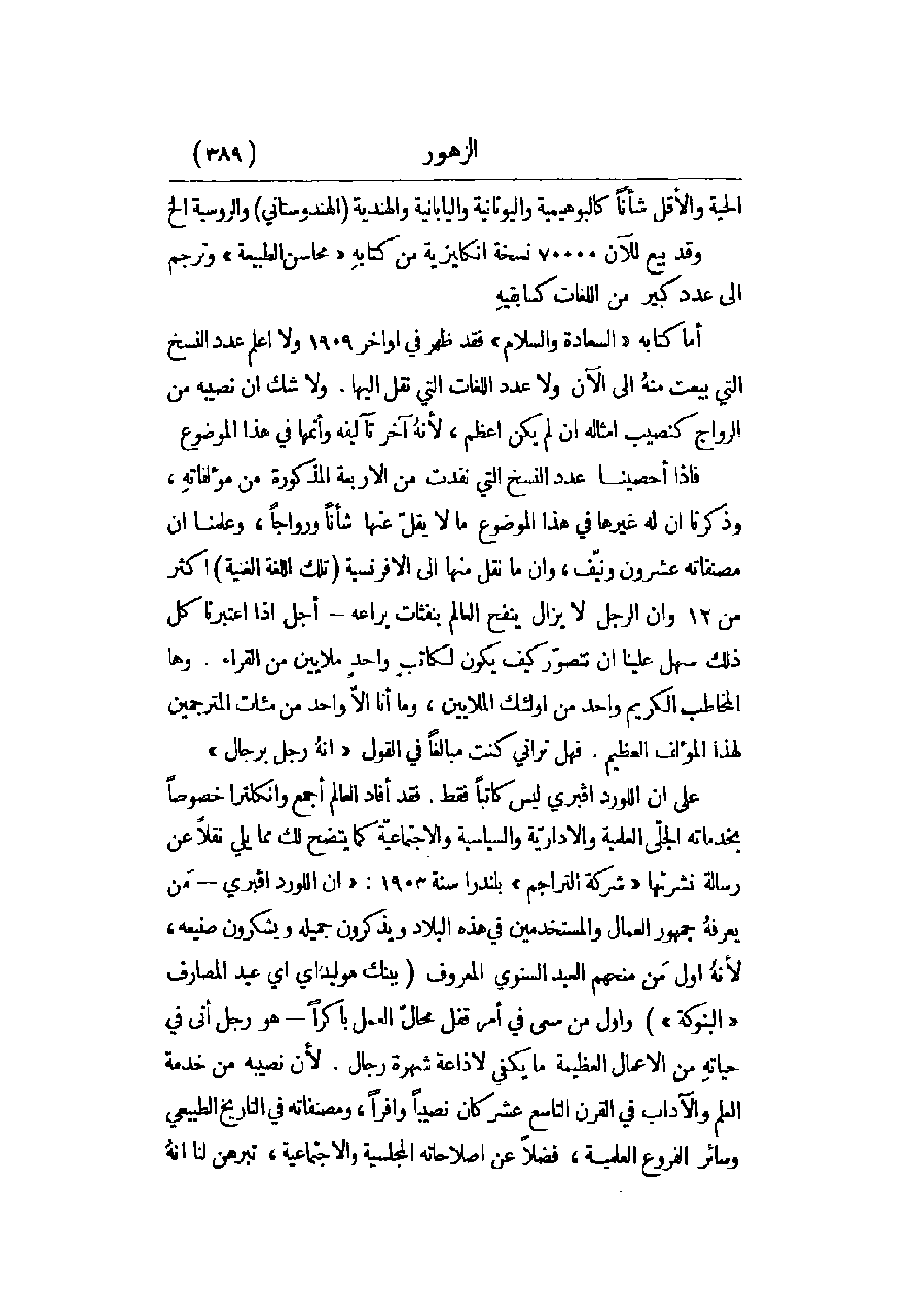 أما كتابه السعادة والسلام فقد ظهر في أواخر 1909 ولا أعلم عدد النسخ التي بيعت منه إلى الآن ولا عدد اللغات التي نقل إليها. ولاشك أن نصيبه من الرواج كنصيب أمثاله إن لم يكن أعظم، لأنه آخر تآليفه وأتمها في هذا الموضوع.
