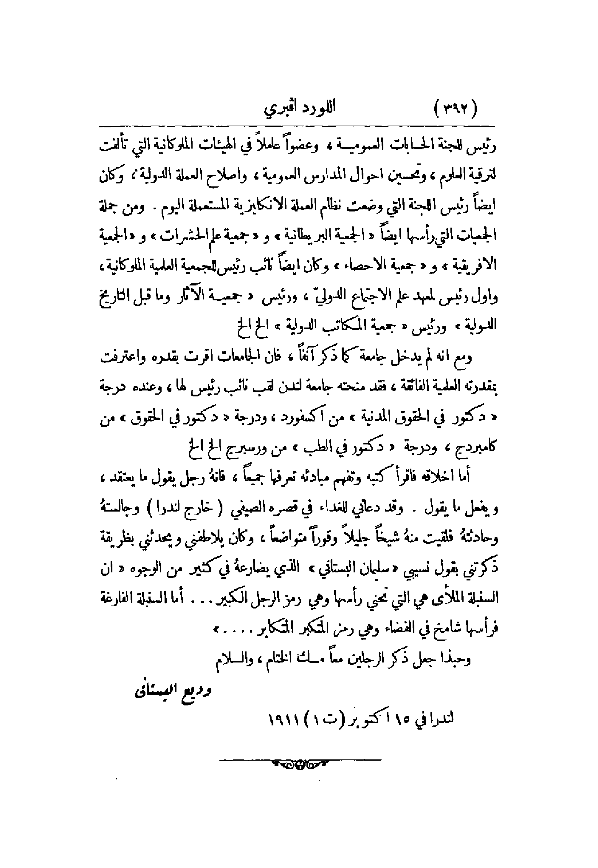 أما أخلاقه فاقرأ كتبه وتفهم مبادئه تعرفها جميعاً، فإنه رجل يقول ما يعتقد، ويفعل ما يقول. وقد دعاني للغداء في قصره الصيفي (خارج لندرا) وجالسته وحادثته فلقيت منه شيخاً جليلاً وقوراً متواضعاً، وكان يلاطفني ويحدثني بطريقةٍ ذكرتني بقول نسيبي سليمان البستاني الذي يضارعه في كثير من الوجوه أن السنبلة الملأى هي التي تحني رأسها وهي رمز الرجل الكبير. . . أما السنبلة الفارغة فرأسها شامخ في الفضاء وهي رمز المتكبر المتكابر. . .
