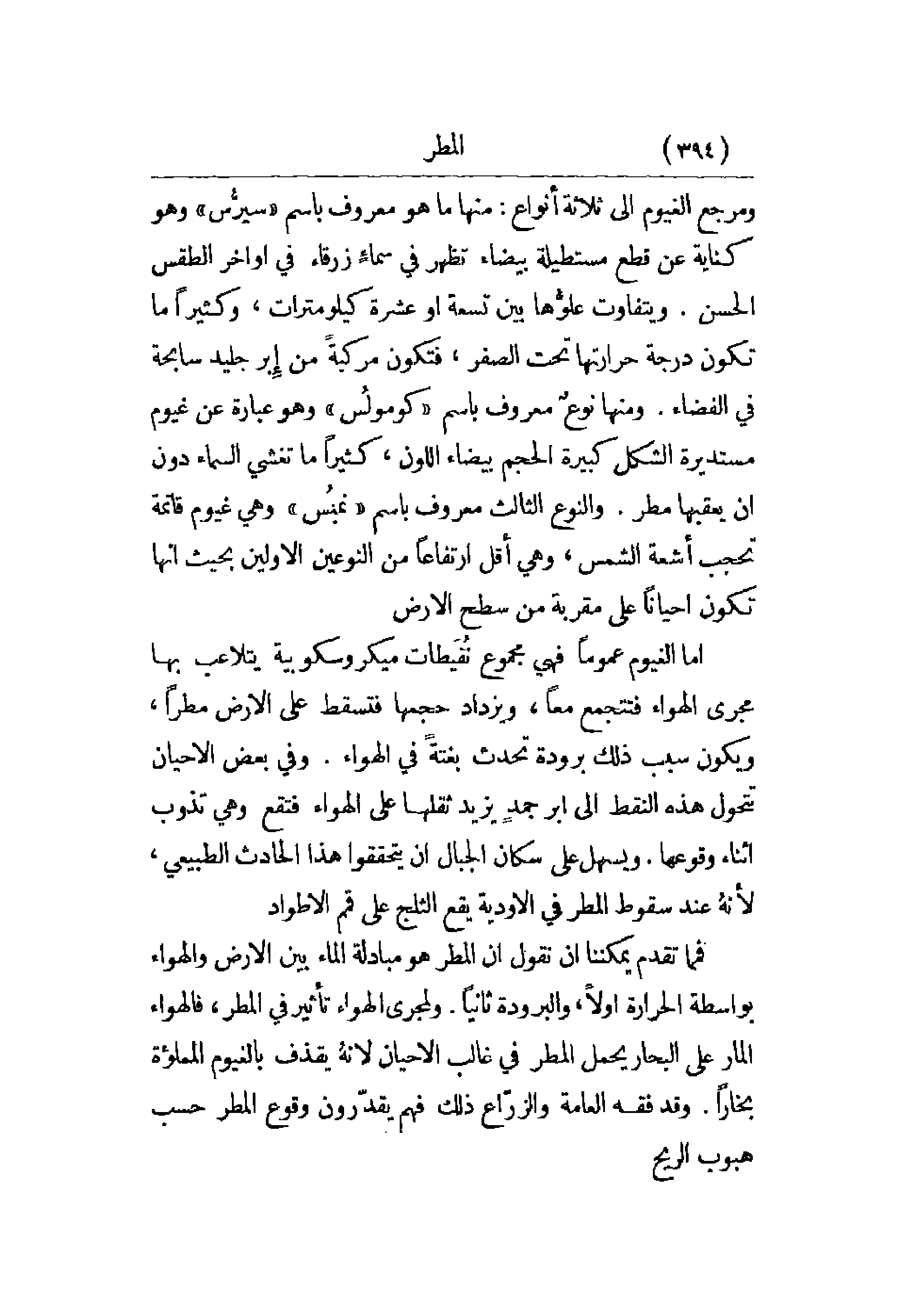 فمما تقدم يمكننا أن نقول إن المطر هو مبادلة الماء بين الأرض والهواء بواسطة الحرارة أولاً، والبرودة ثانياً. ولمجرى الهواء تأثير في المطر، فالهواء الماء على البحار يحمل المطر في غالب الأحيان لأنه يقذف بالغيوم المملوءة بخاراً. وقد فقه العامة والزراع ذلك