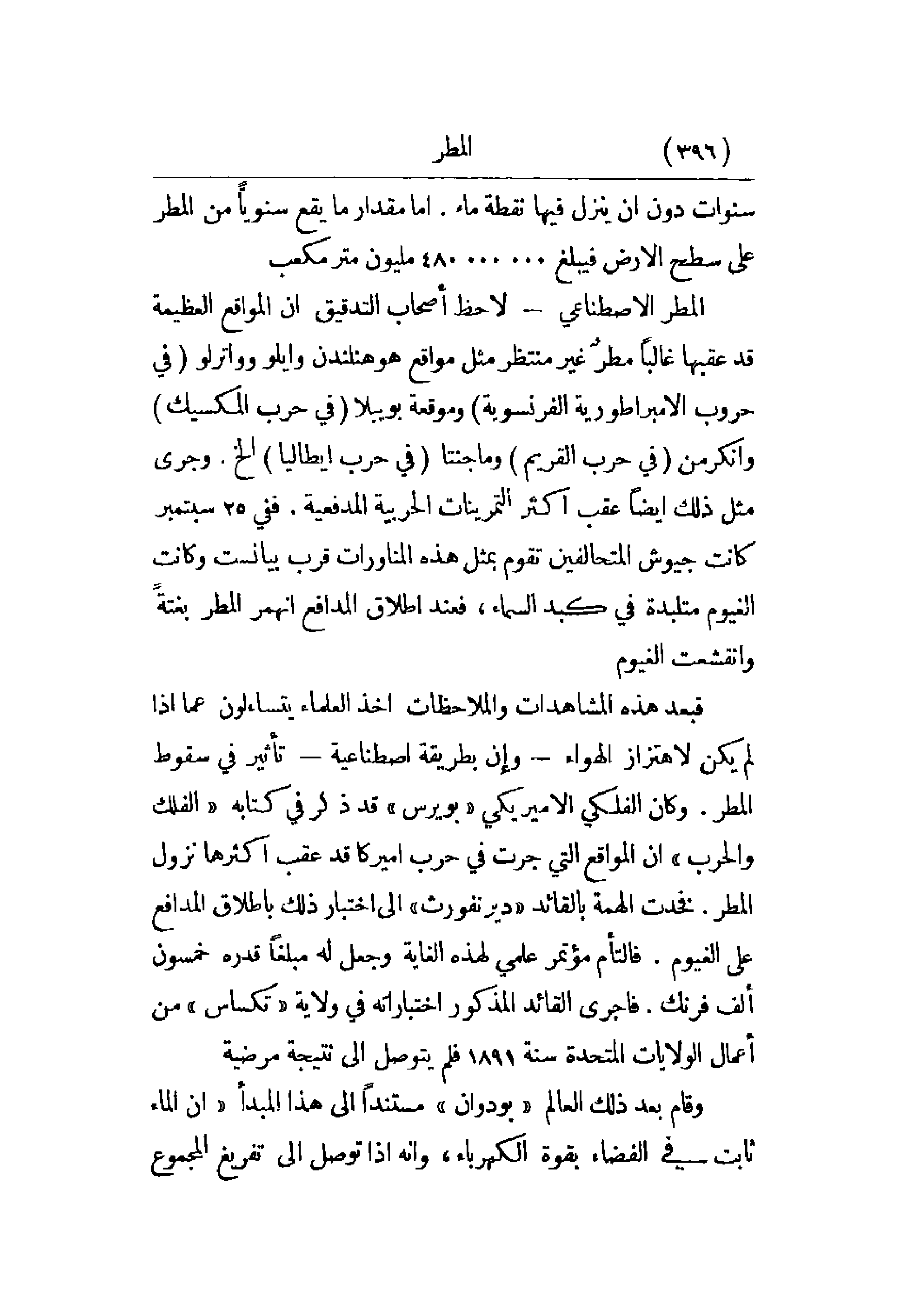 المطر الاصطناعي - لاحظ أصحاب التدقيق أن المواقع العظيمة قد عقبها غالباً مطر غير منتظر مثل مواقع هوهنلندن وايلو وواترلو (في حروب الإمبراطورية الفرنسوية) وماجنتا (في حرب إيطاليا) إلخ. وجرى مثل ذلك أيضاً عقب أكثر التمرينات الحربية المدفعية. ففي 25 سبتمبر كانت جيوش المتحالفين تقوم بمثل هذه المناورات قرب بيانست وكانت الغيوم متلبدة في كبد السماء، فعند إطلاق المدافع انهمر المطر بغتة وانقشعت الغيوم.