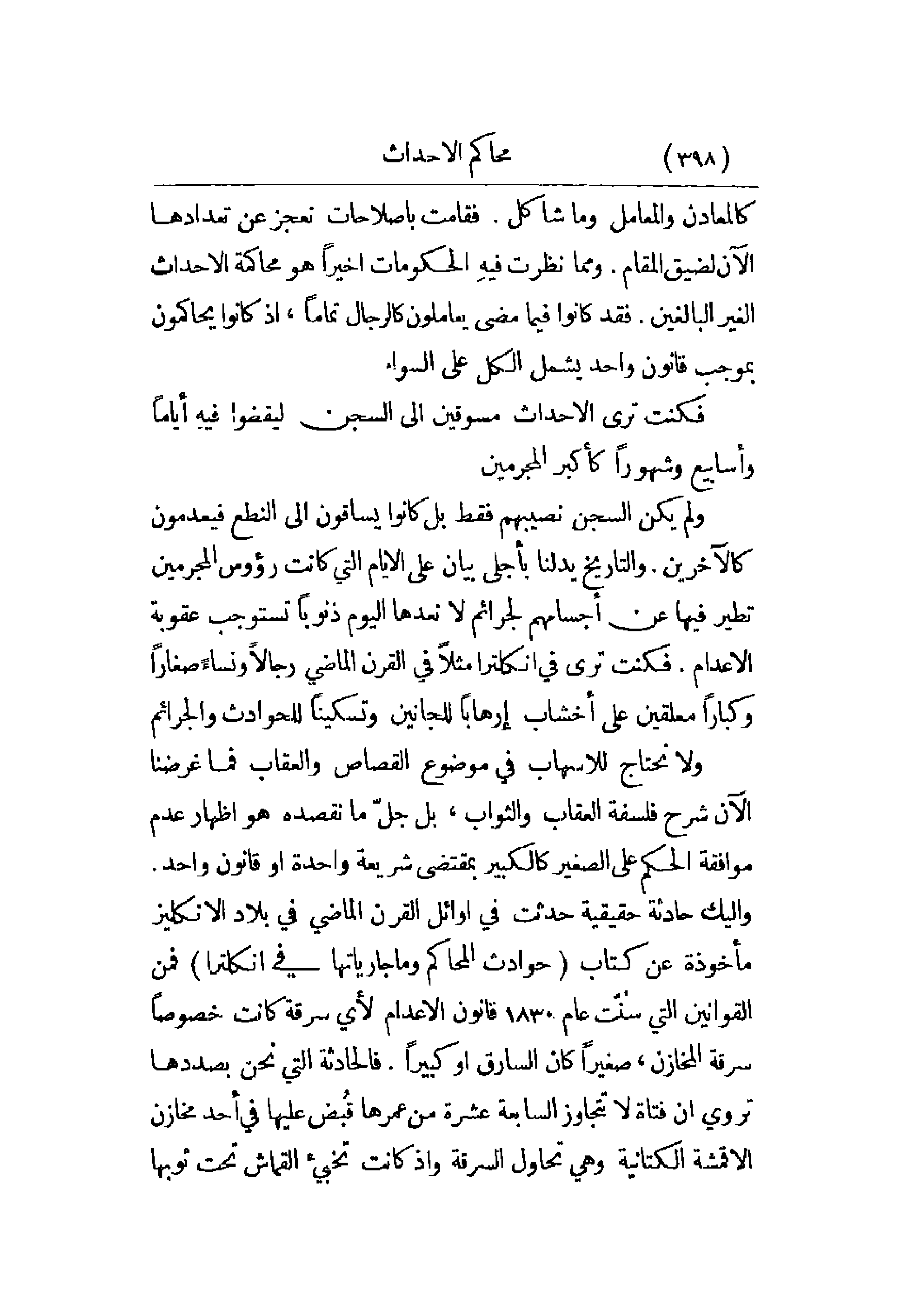 ولا نحتاج للإسهاب في موضوع القصاص والعقاب فما غرضنا الآن شرح فلسفة العقاب والثواب، بل جل ما نقصده هو إظهار عدم موافقة الحكم على الصغير كالكبير بمقتضى شريعة واحدة أو قانون واحد. وإليك حادثة حقيقية حدثت في أوائل القرن الماضي في بلاد الإنكليز مأخوذة عن كتاب (حوادث المحاكم ومجرياتها في إنكلترا) فمن القوانين التي سنت عام 1830 قانون الإعدام لأي سرقة كانت خصوصاً سرقة المخازن، صغيراً كان السارق أو كبيراً. فالحادثة التي نحن بصددها تروي أن فتاة لا تتجاوز السابعة عشرة من عمرها قبض عليها في أحد مخازن الأقمشة الكتانية وهي تحاول السرقة وإذ كانت تخبئ القماش تحت ثوبها