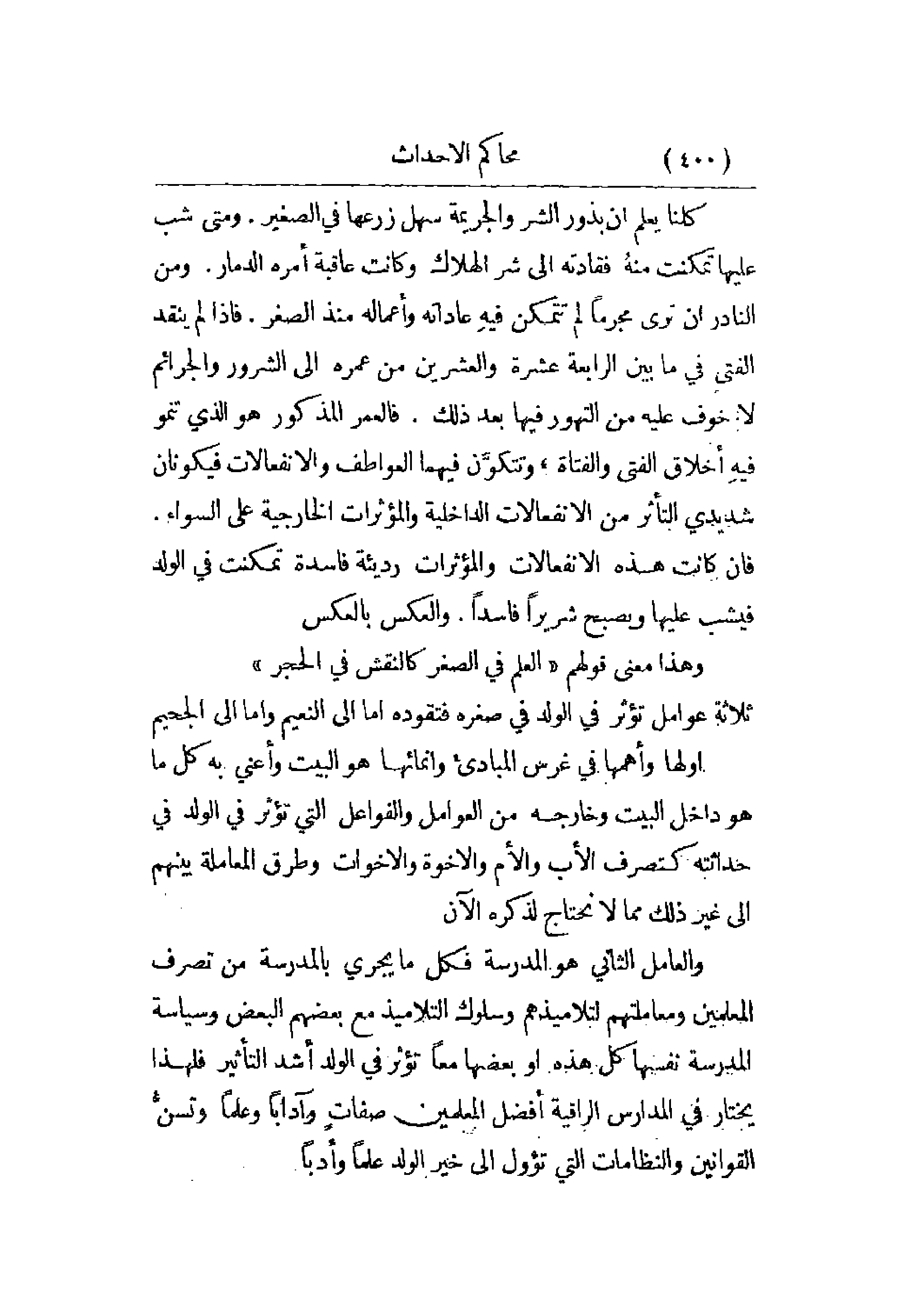 كلنا يعلم أن بذور الشر والجريمة سهل زرعها في الصغير. ومتى شب عليها تمكنت منه فقادته إلى شر الهلاك وكانت عاقبة أمره الدمار. ومن النادر أن ترى مجرماً لم تتمكن فيه عاداته وأعماله منذ الصغر. فإذا لم ينقد الفتى في ما بين الرابعة عشرة والعشرين من عمره إلى الشرور والجرائم لا خوف عليه من التهور فيها بعد ذلك. فالعمر المذكور هو الذي تنمو فيه أخلاق الفتى والفتاة، وتتكون فيهما العواطف والانفعالات فيكونان شديدي التأثر من الانفعالات الداخلية والمؤثرات الخارجية على السواء. فإن كانت هذه الانفعالات والمؤثرات رديئة فاسدة تمكنت في الولد فيشب عليها ويصبح شريراً فاسداً، والعكس بالعكس.