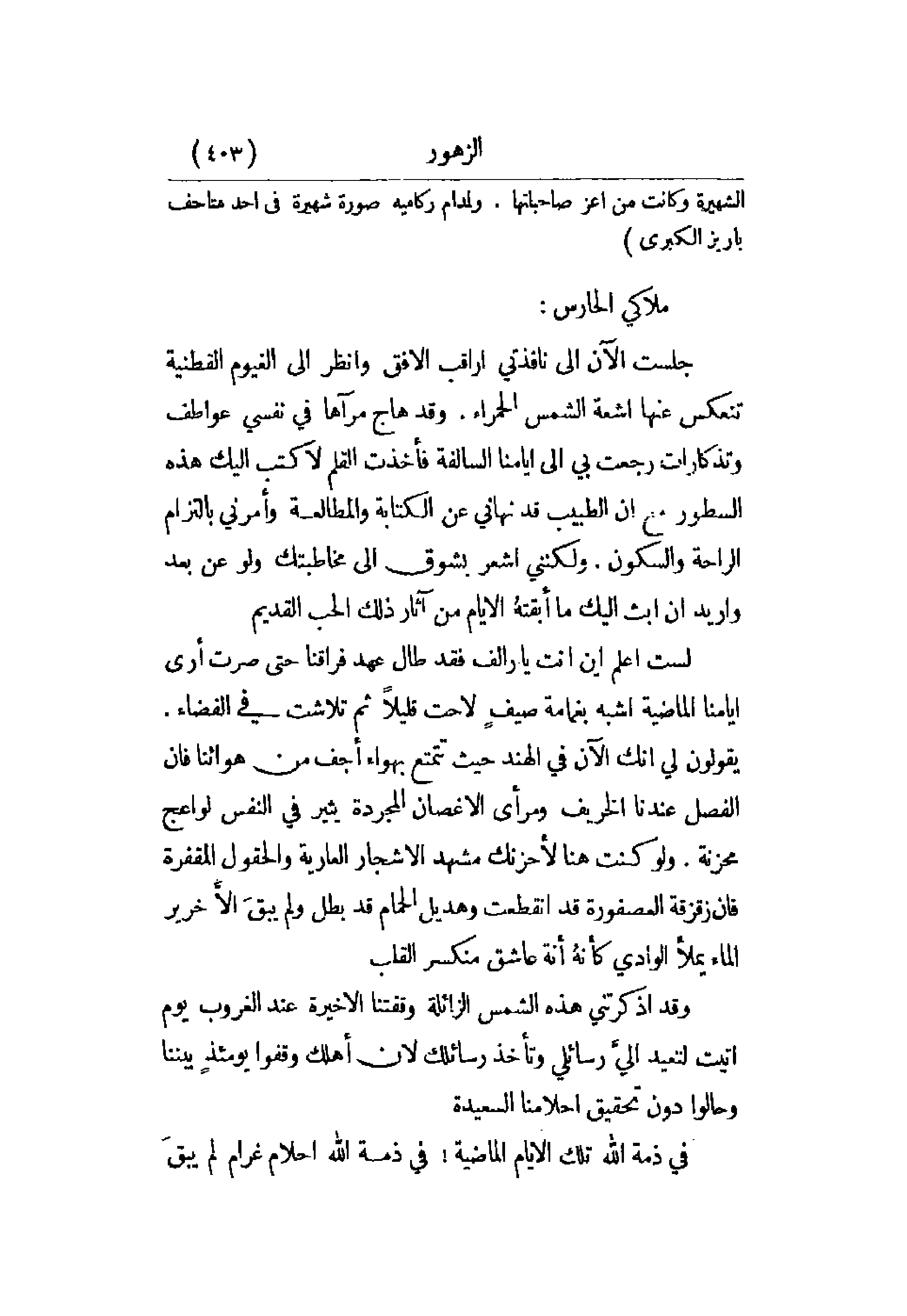 القلم لأكتب إليك هذه السطور مع أن الطبيب قد نهاني عن الكتابة والمطالعة وأمرني بالتزام الراحة والسكون. ولكنني أشعر بشوق إلى مخاطبتك ولو عن بعد وأريد أن أبث إليك ما أبقته الأيام من آثار ذلك الحب القديم.