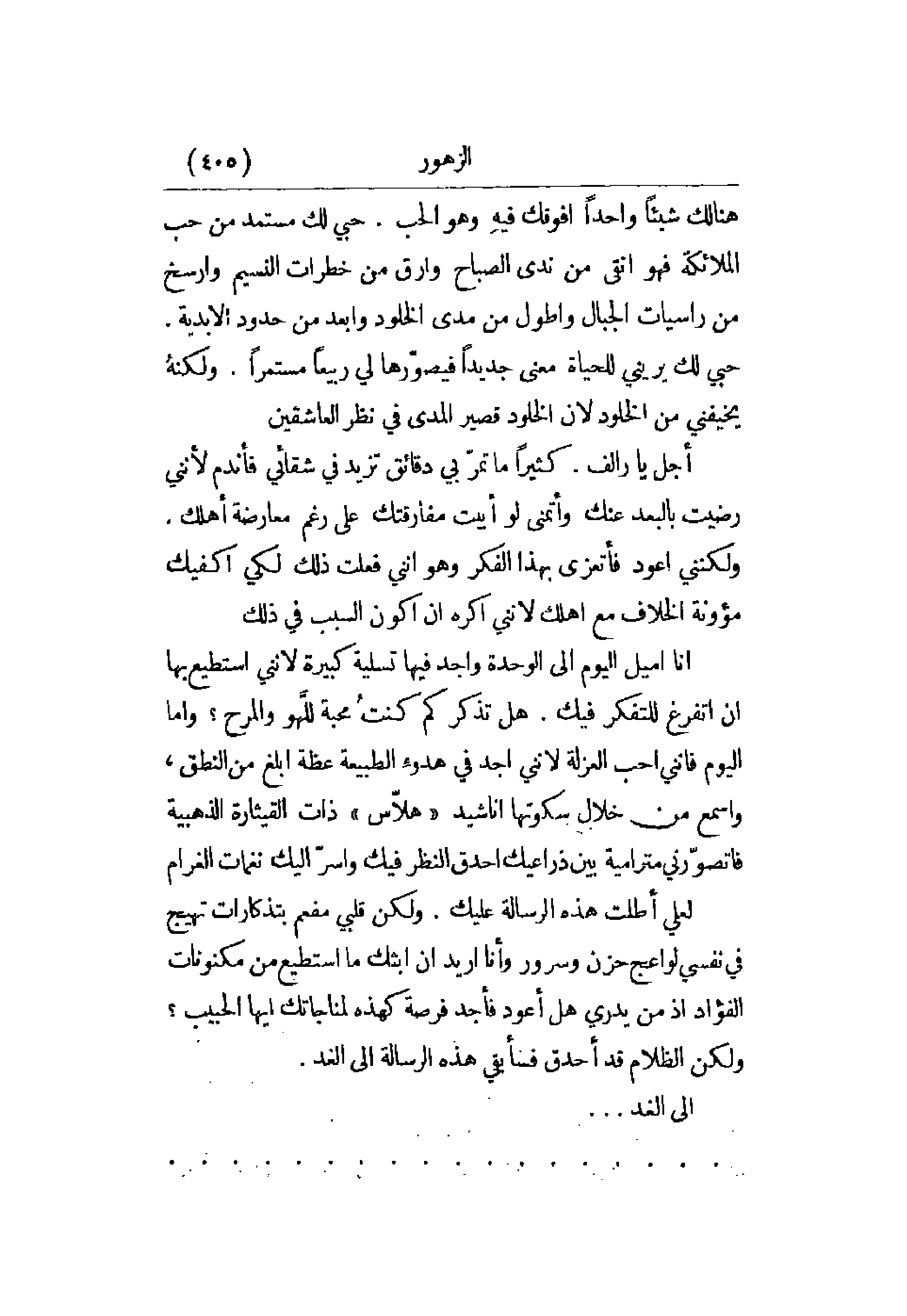 لعلي أطلت هذه الرسالة عليك. ولكن قلبي مفعم بتذكارات تهيج في نفسي لواعج حزن وسرور وأنا أريد أن أبثك ما أستطيع من مكنونات الفؤاد إذ من يدري هل أعود فأجد فرصة كهذه لمناجاتك أيها الحبيب؟ ولكن الظلام قد أحدق فسأبقي هذه الرسالة إلى الغد.