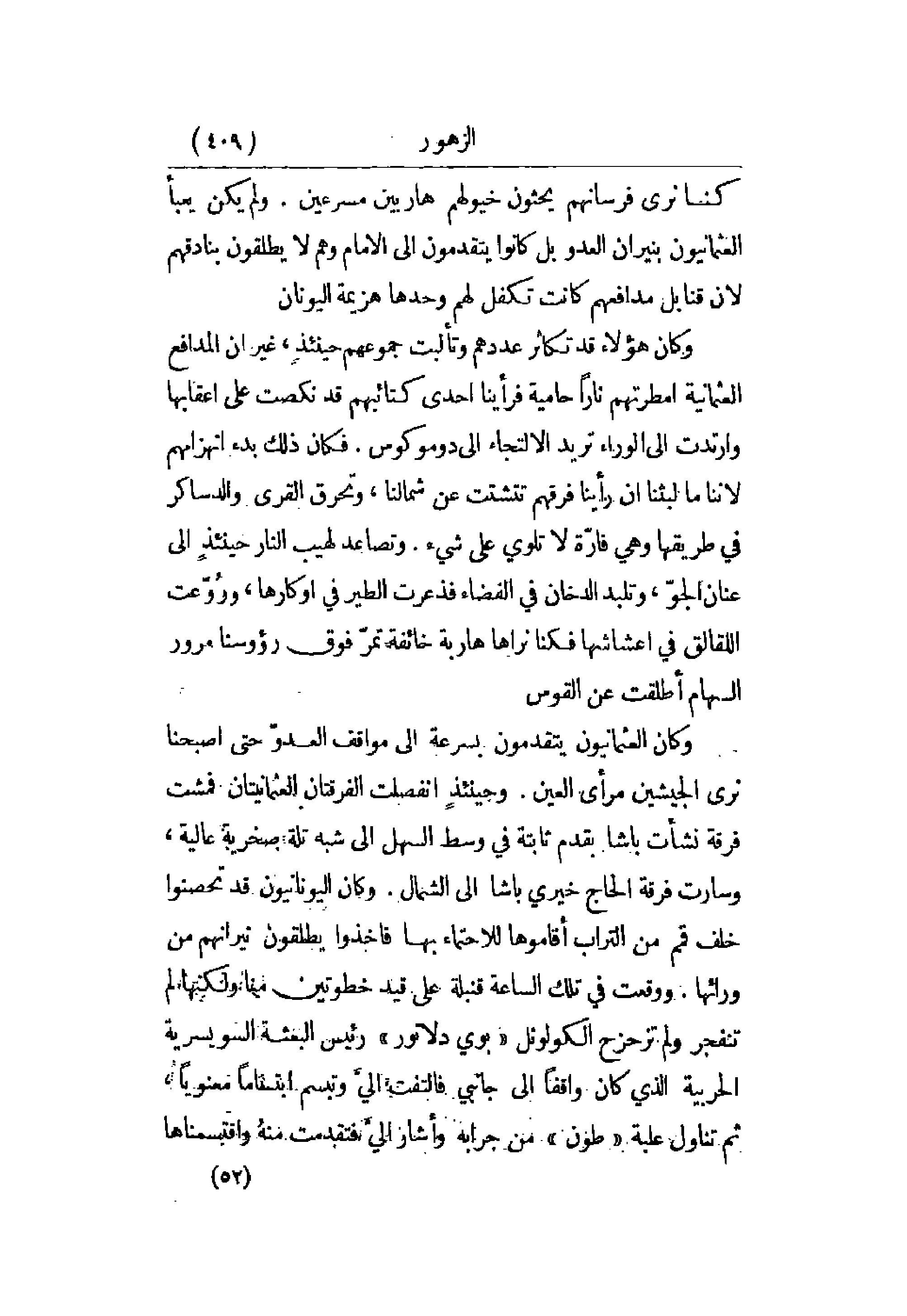 وكان العثمانيون يتقدمون بسرعة إلى مواقف العد حتى أصبحنا نرى الجيشين مرأى العين. وحينئذ انصلت الفرقتان العثمانيتان فمشت فرقة نشأت باشا بقدم ثابتة في وسط السهل إلى شبه تلة صخرية عالية، وسارت فرقة الحاج خيري باشا إلى الشمال. وكان اليونانيون قد تحصنوا خلف قمم من التراب أقاموها للاحتماء بها فأخذوا يطلقون نيرانهم من ورائها. ووقعت في تلك الساعة قنبلة على قيد خطوتين منا ولكنها لم تنفجر ولم تزحزح الكولونل بوي دلاتور رئيس البعثة السويسرية الحربية الذي كان واقفاً إلى جانبي فالتفت إلي وتبسم ابتساماً معنوياً، ثم تناول علبة طون من جرابه وأشار إلي فتقدمت منه واقتسمناها