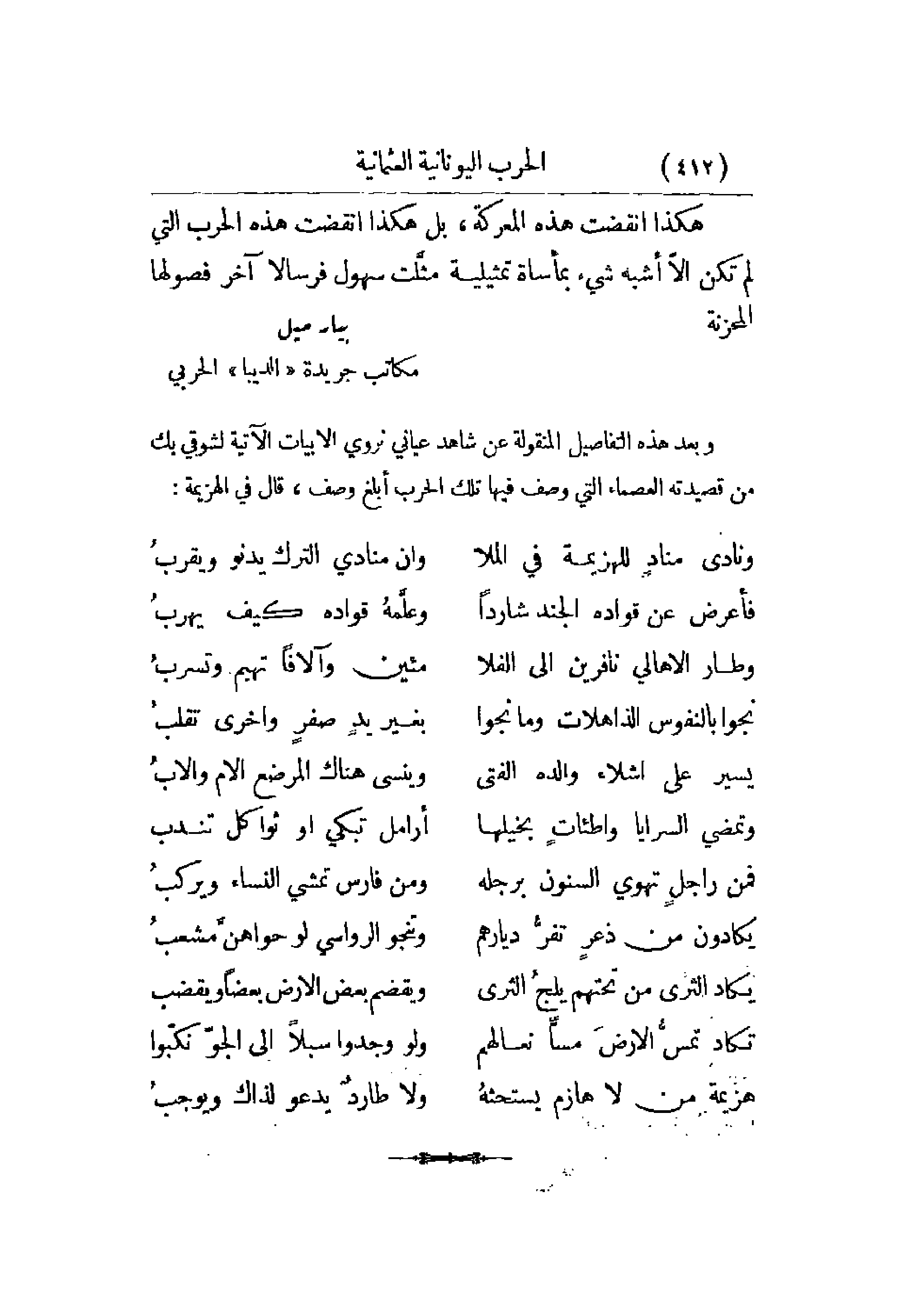 وبعد هذه التفاصيل المنقولة عن شاهد عياني نروي الأبيات الآتية لشوقي بك من قصيدته العصماء التي وصف فيها تلك الحرب أبلغ وصف، قال في الهزيمة: