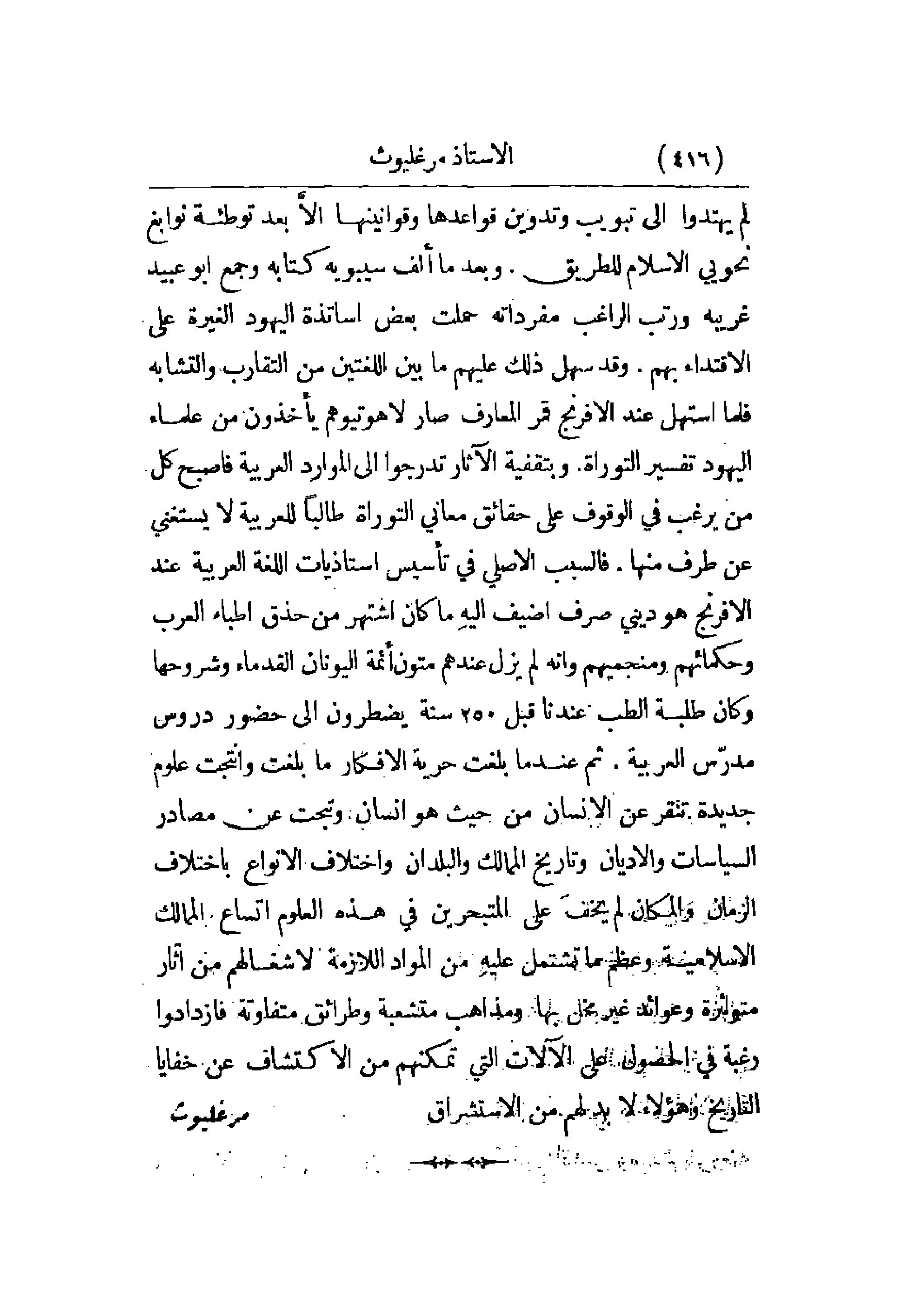 لم يهتدوا إلى تبويب وتدوين قواعدها وقوانينها إلا بعد توطئة نوابغ نحويي الإسلام للطريق. وبعد ما ألف سيبويه كتابه وجمع أبو عبيد غريبه ورتب الراغب مفرداته حملت بعض أساتذة اليهود الغيرة على الاقتداء بهم. وقد سهل ذلك عليهم ما بين اللغتين من التقارب والتشابه فلما استهل عند الإفرنج قمر المعارف صار لاهوتيوهم يأخذون من علماء اليهود تفسير التوراة. وبتقفية الآثار تدرجوا إلى الموارد العربية فأصبح كل من يرغب في الوقوف على حقائق معاني التوراة طالباً للعربية لا يستغني عن طرف منها. فالسبب الأصلي في تأسيس أستاذيات اللغة العربية عند الإفرنج هو ديني صرف أضيف إليه ما كان اشتهر من حذق أطباء العرب وحكمائهم ومنجميهم وأنه لم يزل عندهم متون أئمة اليونان القدماء وشروحها وكان طلبة الطب عندنا قبل 250 سنة يضطرون إلى حضور دروس مدرس العربية. ثم عندما بلغت حرية الأفكار ما بلغت وأنتجت علوم جديدة تنقر عن الإنسان من حيث هو إنسان وتبحث عن مصادر السياسات والأديان وتاريخ الممالك