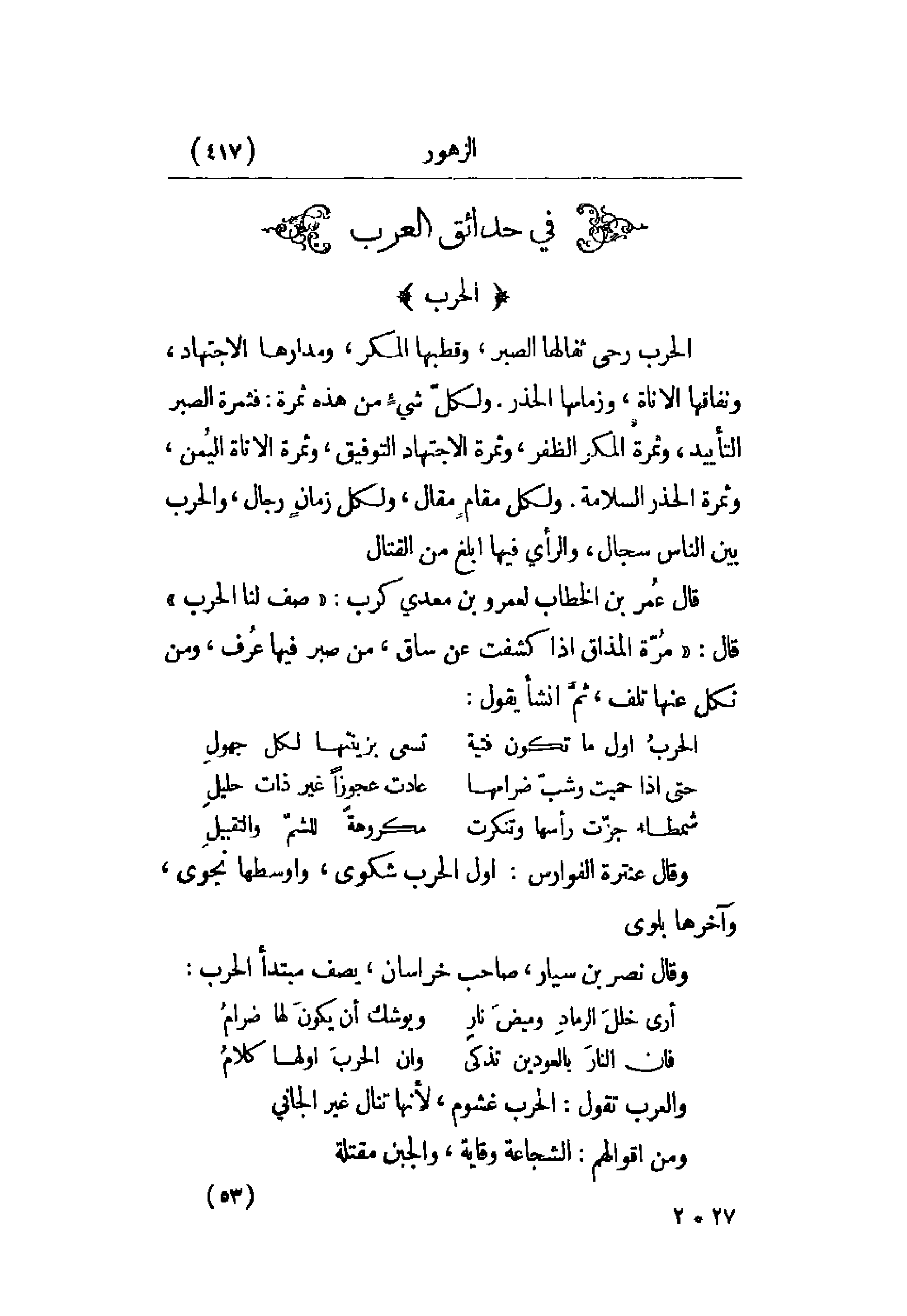 قال عمر بن الخطاب لعمرو بن معدي كرب: صف لنا الحرب قال: مرة المذاق إذا كشفت عن ساق، من صبر فيها عرف، ومن نكل عنها تلف، ثم أنشأ يقول: