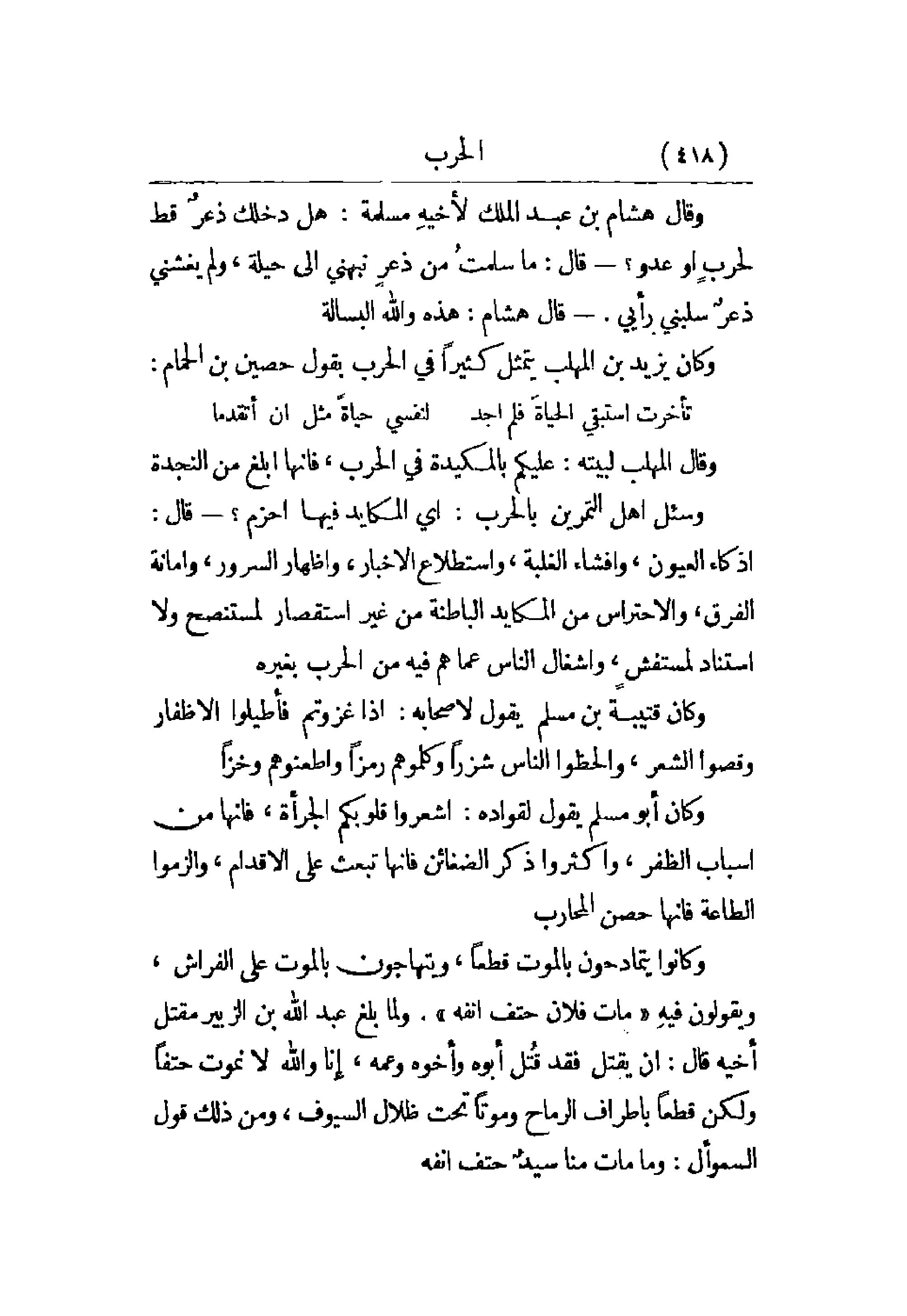 وقال هشام بن عبد الملك لأخيه مسلمة: هل دخلك ذعر قط لحرب أو عدو؟ - قال: ما سلمت من ذعر نبهني إلى حيلة، ولم يغشني ذعر سلبني رأيي. - قال هشام: هذه والله البسالة.
