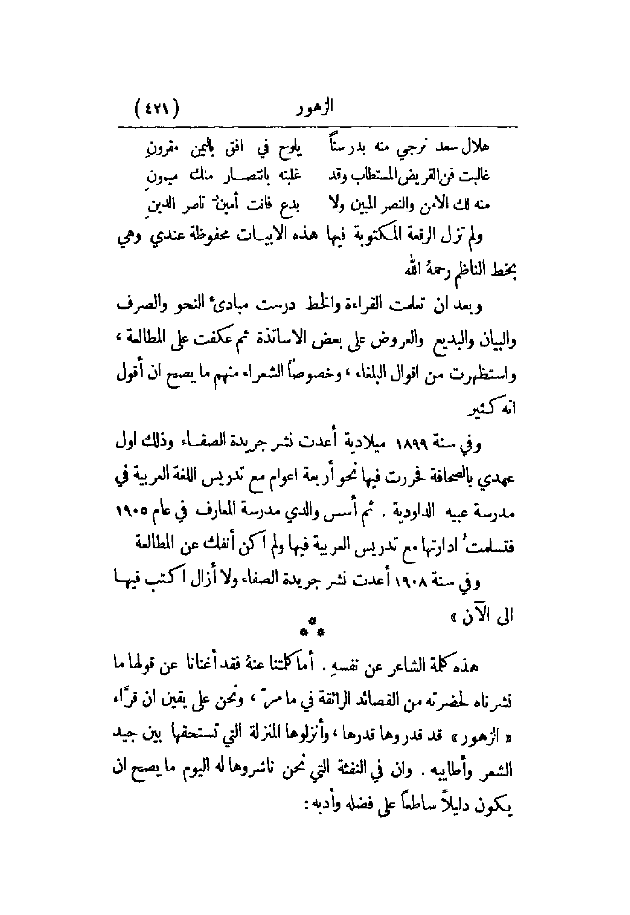 هذه كلمة الشاعر عن نفسه. أما كلمتنا عنه فقد أغنانا عن قولها ما نشرناه لحضرته من القصائد الرائقة في ما مر، ونحن على يقين أن قراء الزهور قد قدروها قدرها، وأنزلوها المنزلة التي تستحقها بين جيد الشعر وأطايبه. وإن في النفثة التي نحن ناشروها له اليوم ما يصح أن يكون دليلاً ساطعاً على فضله وأدبه: