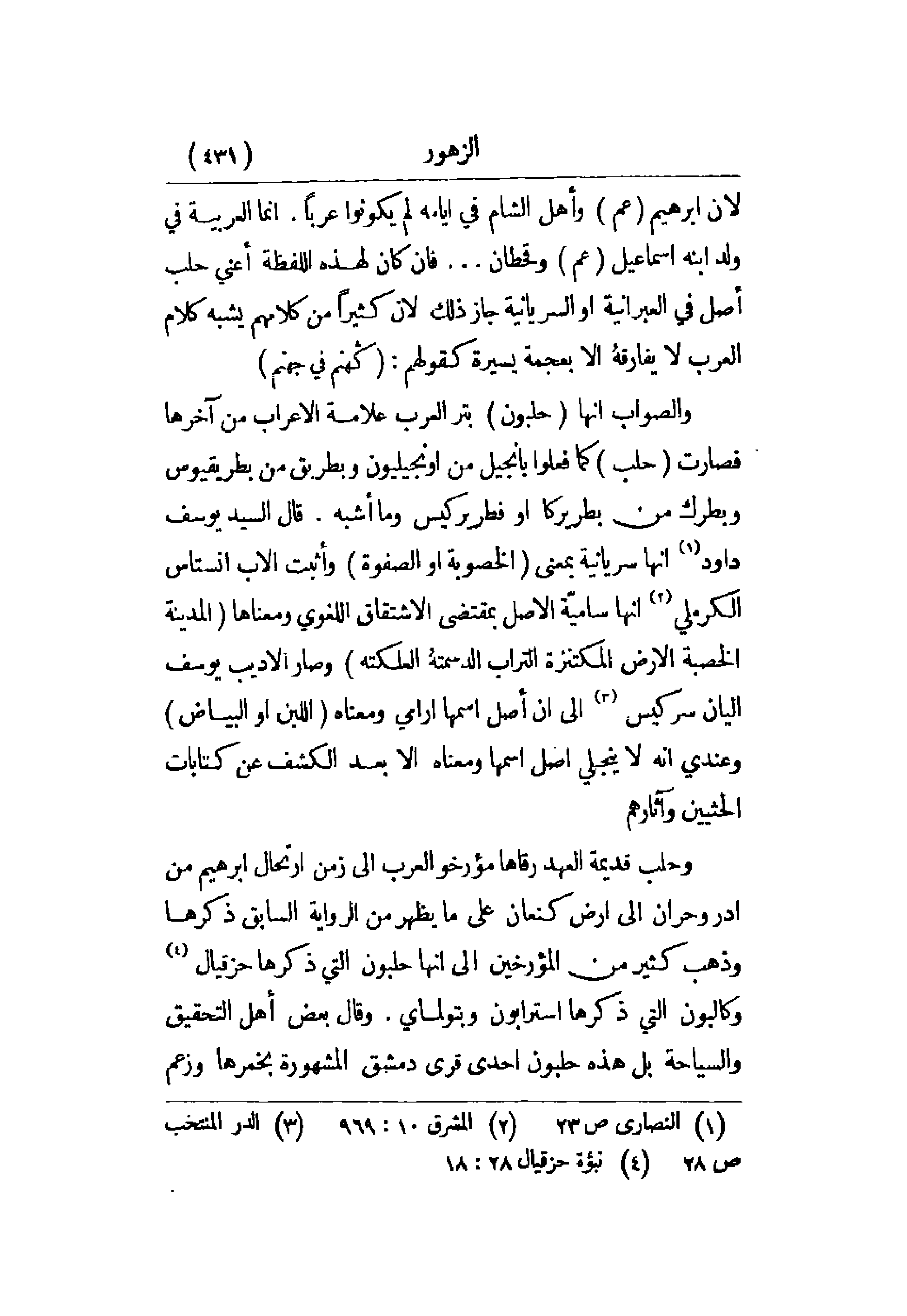 لأن إبراهيم (عم) وأهل الشام في أيامه لم يكونوا عرباً. إنما العربية في ولد ابنه إسماعيل (عم) وقحطان. . . فإن كان لهذه اللفظة أعني حلب أصل في العبرانية أو السريانية جاز ذلك لأن كثيراً من كلامهم يشبه كلام العرب لا يفارقه إلا بعجمة يسيرة كقولهم: (كهنم في جهنم).