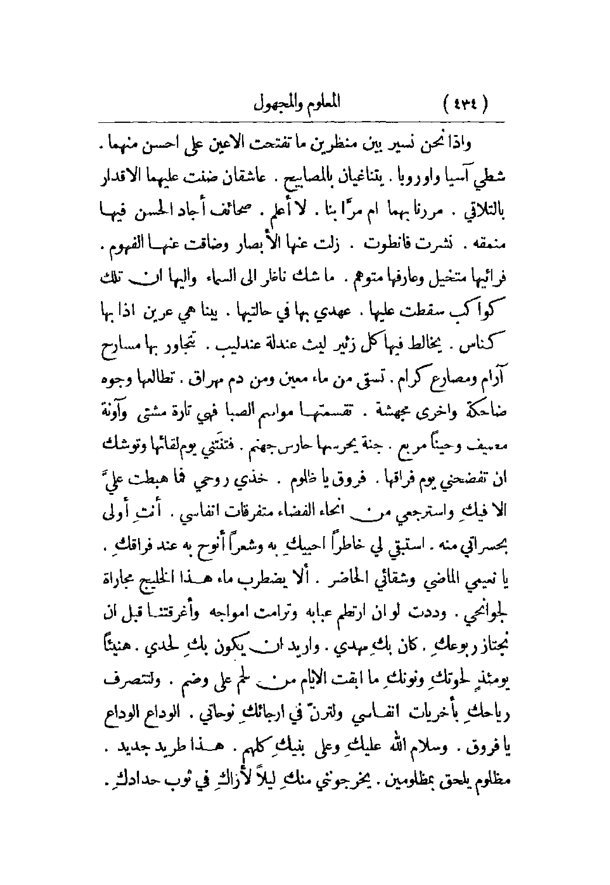 وإذا نحن نسير بين منظرين ما تفتحت الأعين على أحسن منهما. شطي آسيا وأوروبا. يتناغيان بالمصابيح. عاشقان عليهما الأقدار بالتلاقي. مرننا بهما أم مرّا بنا. لا أعلم. صحائف أجاد الحسن فيها منمقة. نشرت فانطوت. زلت عنها الأبصار وضاقت عنها الفهوم. فرائيها متخيل وعارفها متوهم. ما شك ناظر إلى السماء وإليها أن تلك كواكب سقطت عليها. عهدي بها في حاليتها. بينا هي عرين إذا بها كناس. يخالط فيها كل زئير ليث عندليب. تتجاور بها مسارح آرام ومصارع كرام. تسقى من ماء معين ومن دم مهراق. تطالعها وجوه ضاحكة وأخرى مجهشة. تقسمتها مواسم الصبا فهي تارة مشتى وآونة مصيف وحيناً مربع. جنة يحرسها حارس جهنم. فتنتني يوم لقائها وتوشك أن تفضحني يوم فراقها. فروق يا ظلوم. خذي روحي فما هبطت علي إلا فيك واسترجعي من أنحاء الفضاء متفرقات أنفاسي. أنت أولى بحسراتي منه. استبقي لي خاطراً أحييك به وشعراً أنوح به عند فراقك يا نعيمي الماضي وشقائي الحاضر. ألا يضطرب ماء هذا