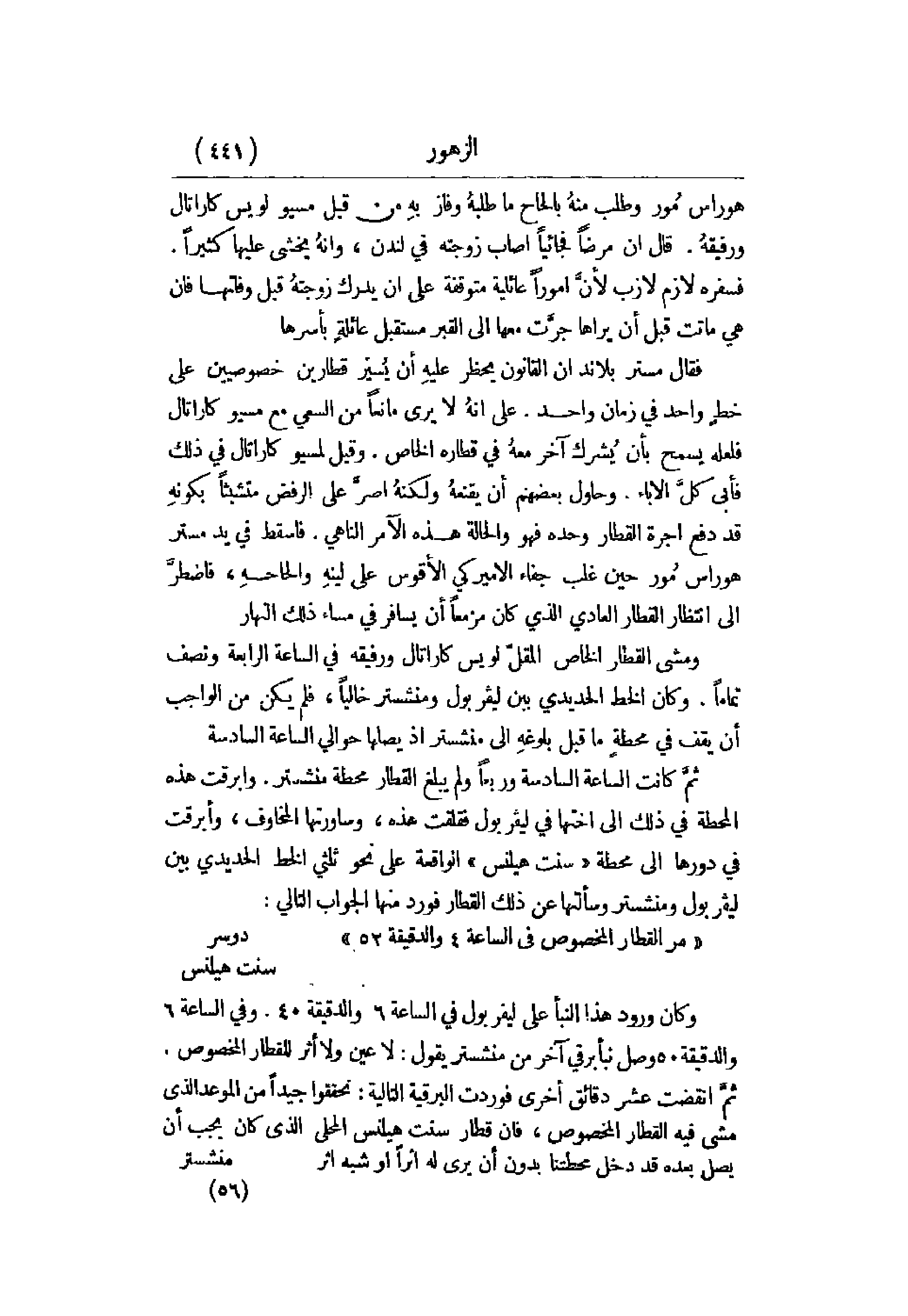 آخر معه في قطاره الخاص. وفيل لمسيو كاراتال في ذلك فأبى كل الإباء. وحاول بعضهم أن يقنعه ولكنه أصر على الرفض متشبثاً بكونه قد دفع أجرة القطار وحده فهو والحالة هذه الآمر الناهي. فأسقط في يد مستر هوراس مور حين غلب جفاء الأمريكي الأقوس على لينه وإلحاحه، فاضطر إلى انتظار القطار العادي الذي كان مزمعاً أن يسافر في مساء ذلك النهار.