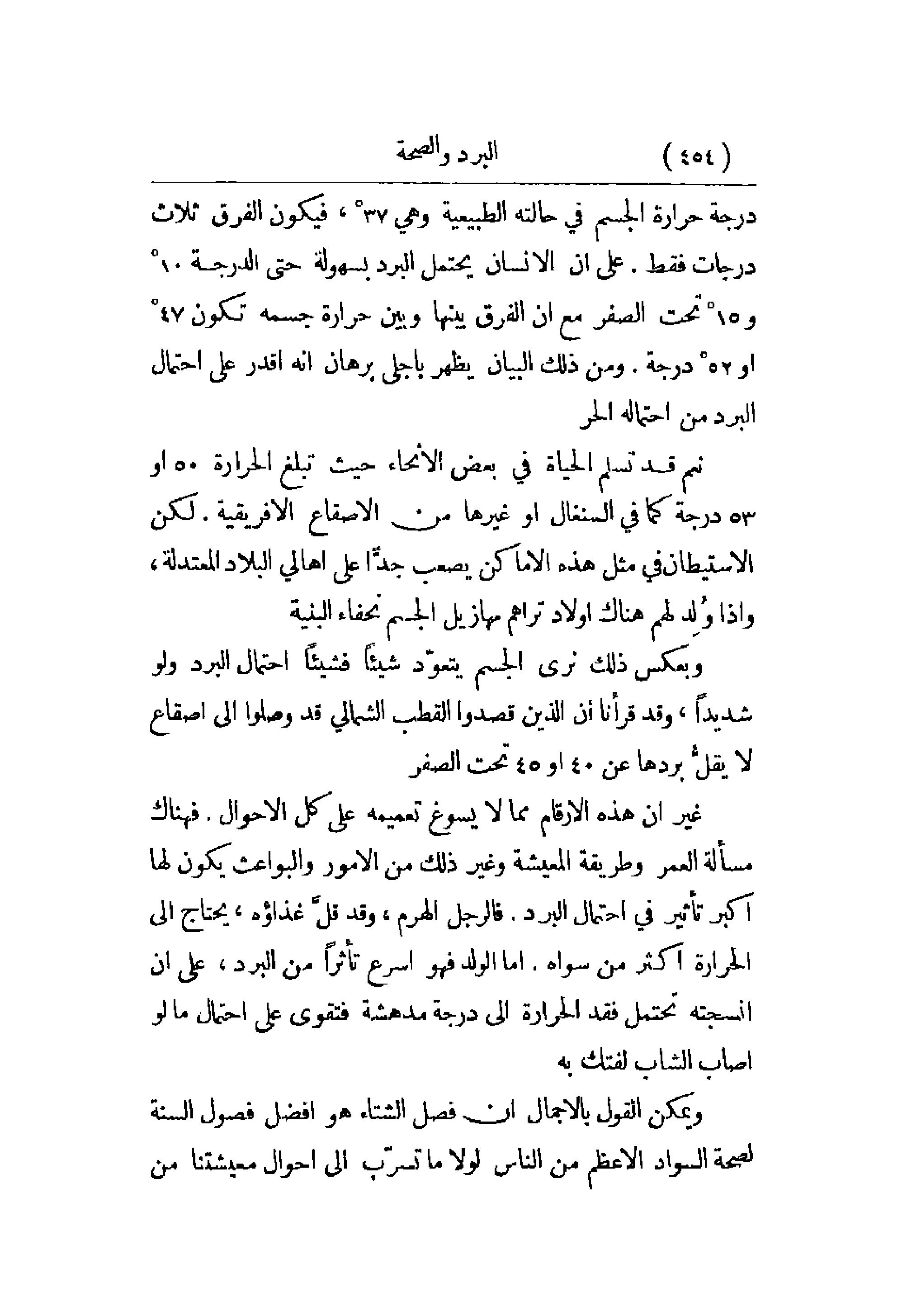 درجة حرارة الجسم في حالته الطبيعية وهي 37 ْ، فيكون الفرق ثلاث درجات فقط. على أن الإنسان يحتمل البرد بسهولة حتى الدرجة 10 ْ و15 ْ تحت الصفر مع أن الفرق بينها وبين حرارة جسمه تكون 47 ْ أو 52 ْ درجة. ومن ذلك البيان يظهر بأجلى برهان انه أقدر على احتمال البرد من احتماله الحر.