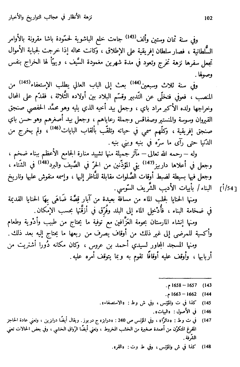 ومنها إنشاء المارستان بحومة العزّافين مع توفية ما يحتاج من طبيب وأدوية وطعام وأكسية للمرضى إلى غير ذلك من أوقاف يصرف من ريعها ما يحتاج إليه بعد ذلك.