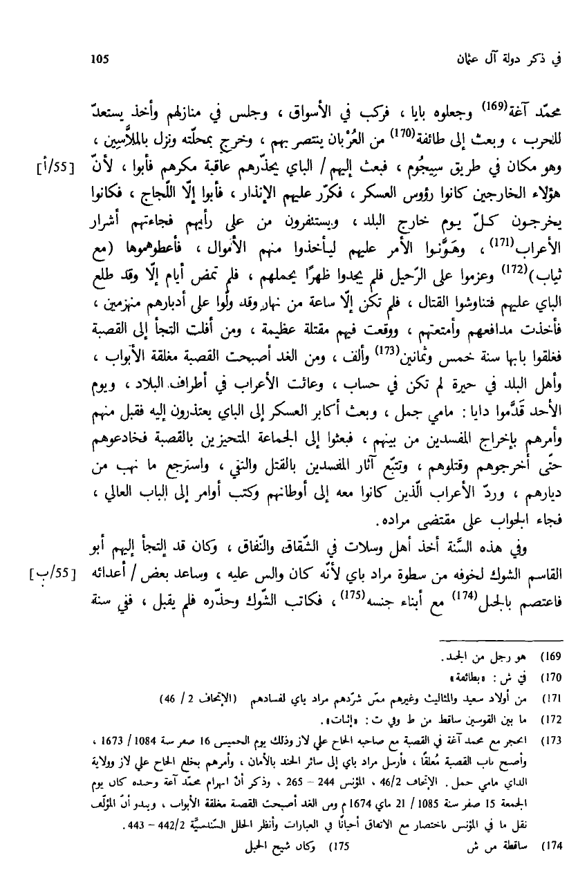 (¬173) انحجز مع محمد آغة في القصبة مع صاحبه الحاج علي لاز وذلك يوم الخميس 16 صفر سنة 1084/ 1673، وأصبح باب القصبة مغلقا، فأرسل مراد باي إلى سائر الجند بالأمان، وأمرهم بخلع الحاج علي لاز وولاية الداي مامي جمل: الإتحاف 2/ 46، المؤنس 244 - 265، وذكر أنّ انهزام محمّد آغة وجنده كان يوم الجمعة 15 صفر سنة 1085/ 21 ماي 1674 م ومن الغد أصبحت القصبة مغلقة الأبواب، ويبدو أنّ المؤلّف نقل ما في المؤنس باختصار مع الاتفاق أحيانا في العبارات وأنظر الحلل السّندسيّة 2/ 442 - 443.