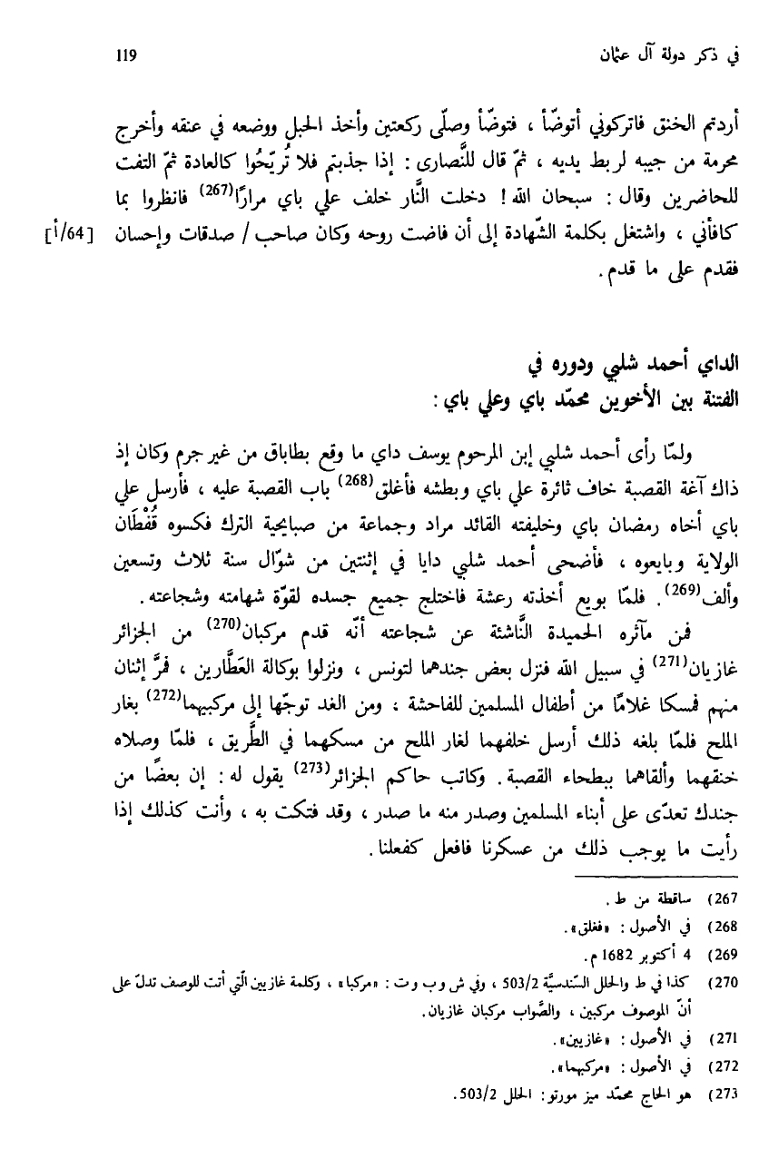 أردتم الخنق فاتركوني أتوضّأ، فتوضّأ وصلّى ركعتين وأخذ الحبل ووضعه في عنقه وأخرج محرمة من جيبه لربط يديه، ثمّ قال للنّصارى: إذا جذبتم فلا تريّحوا كالعادة ثمّ التفت للحاضرين وقال: سبحان الله! دخلت النّار خلف علي باي مرارا (¬267) فانظروا بما كافأني، واشتغل بكلمة الشّهادة إلى أن فاضت روحه وكان صاحب / صدقات وإحسان فقدم على ما قدم.