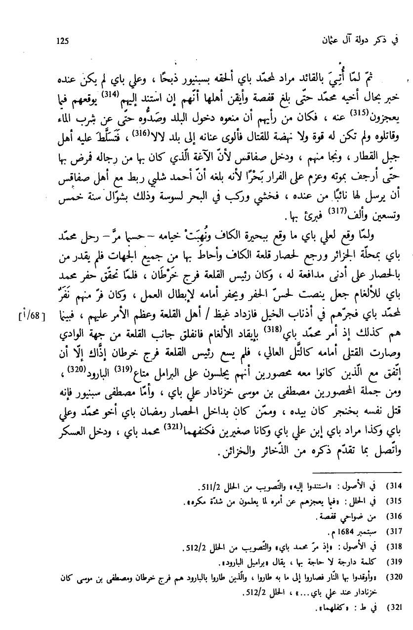 (¬320) «وأوقدوا بها النّار فصاروا إلى ما به طاروا، والّذين طاروا بالبارود هم فرج خرطان ومصطفى بن موسى كان خزنادار عند علي باي. . .»، الحلل 2/ 512.