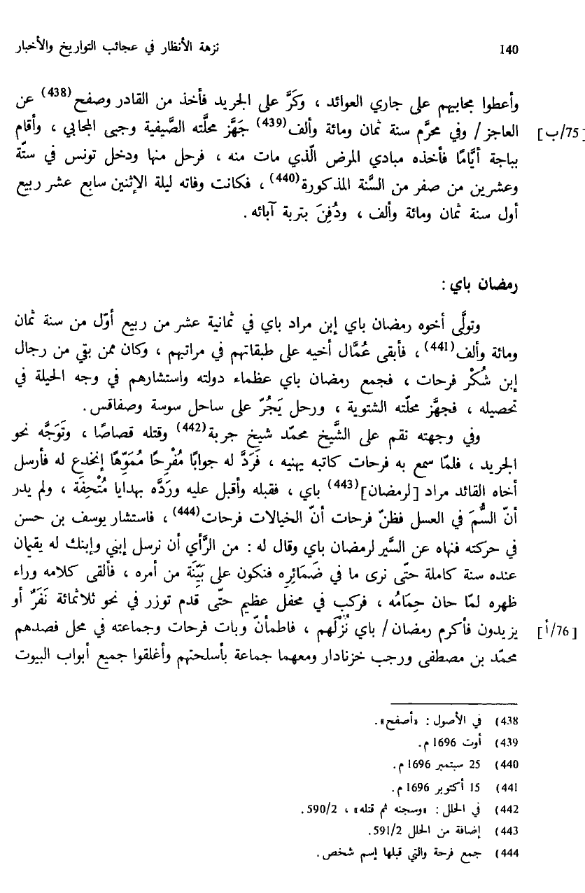 وفي وجهته نقم على الشّيخ محمّد شيخ جربة (¬442) وقتله قصاصا، وتوجّه نحو الجريد، فلمّا سمع به فرحات كاتبه يهنيه، فردّ له جوابا مفرحا مموّها إنخدع له فأرسل أخاه القائد مراد [لرمضان] (¬443) باي، فقبله وأقبل عليه وردّه بهدايا متحفة، ولم يدر أنّ السّم في العسل فظنّ فرحات أنّ الخيالات فرحات (¬444)، فاستشار يوسف بن حسن في حركته فنهاه عن السّير لرمضان باي وقال له: من الرّأي أن نرسل إبني وإبنك له يقيمان عنده سنة كاملة حتّى نرى ما في ضمائره فنكون على بيّنة من أمره، فألقى كلامه وراء ظهره لمّا حان حمامه، فركب في محفل عظيم حتّى قدم توزر في نحو ثلاثمائة نفر أو يزيدون فأكرم رمضان / باي نزلهم، فاطمأنّ وبات فرحات وجماعته في محل فصدهم محمّد بن مصطفى ورجب خزنادار ومعهما جماعة بأسلحتهم وأغلقوا جميع أبواب البيوت