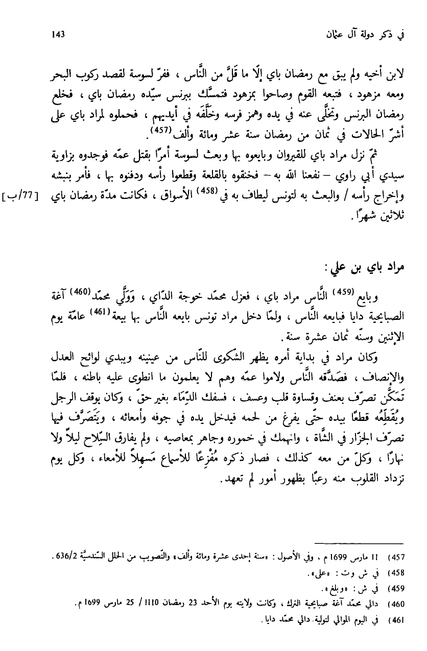 (¬457) 11 مارس 1699 م، وفي الأصول: «سنة إحدى عشرة ومائة وألف» والتّصويب من الحلل السّندسيّة 2/ 636.