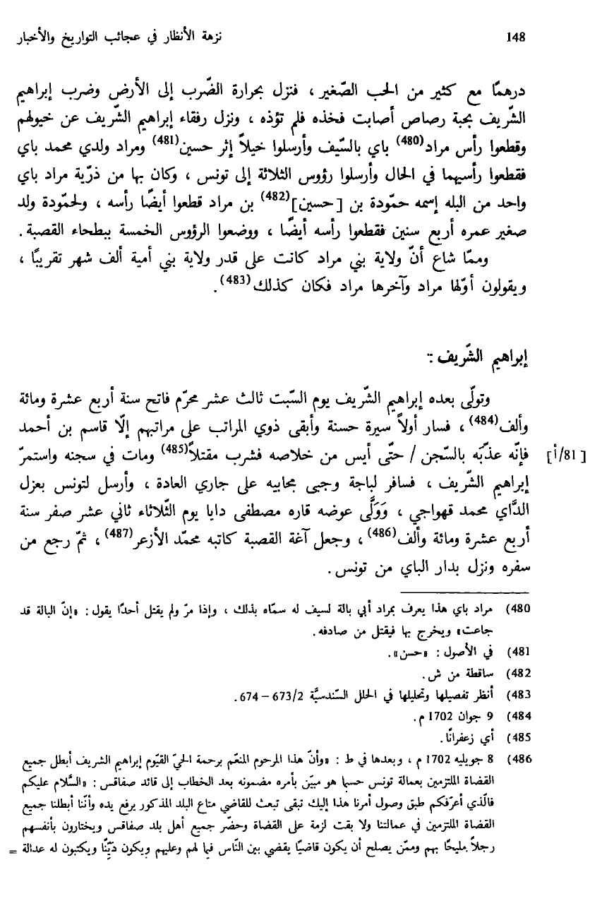 (¬486) 8 جويليه 1702 م، وبعدها في ط: «وأنّ هذا المرحوم المنعّم برحمة الحيّ القيّوم إبراهيم الشريف أبطل جميع القضاة الملتزمين بعمالة تونس حسبما هو مبيّن بأمره مضمونه بعد الخطاب إلى قائد صفاقس: «السّلام عليكم فالّذي أعرّفكم طبق وصول أمرنا هذا إليك تبقى تبعث للقاضي متاع البلد المذكور يرفع يده وأنّنا أبطلنا جميع القضاة الملتزمين في عمالتنا ولا بقت لزمة على القضاة وحضّر جميع أهل بلد صفاقس ويختارون بأنفسهم رجلا مليحا بهم وممّن يصلح أن يكون قاضيا يقضي بين النّاس فيما لهم وعليهم ويكون ديّنا ويكتبون له عدالة - بالتّقديم بأنّهم رضوا به بأنّه يكون قاضيا عليهم ويحكم بين النّاس بالحقّ بما أتت به السّنّة المحمّدية ولا يأخذ من المتحاكمين شيئا سواء كان مدعي أو مدّعى عليه ولا يأخذ على الوفى ولا على جميع القوانين شيئا وجعلنا له من عندنا أربعة نواصر في كلّ يوم تبقى تدفع له العدد المذكور ونحن نحاسبك بذلك والذي نسمع به أعطاه شيئا أو أخذ هو من الناس شيئا حتى ناصري واحد يقع فيه الحكم الشّديد والسّلام من الفقير إلى ربّه الشّريف إبراهيم [دالي] باي وفّقه الله أواخر رجب سنة أربعة عشر ومائة وألف» وبمحوله طابعه وقف عليه كاتبه وابتداؤنا وأن هذا المرحوم المنعّم برحمة الحيّ القيّوم إبراهيم الشريف وجدته في الطّرّة فجعلته في الصّحيفة خوفا من ضيق الطّرة الخ. وهذا النّص موجود في «ب» في غير هذا الموضع وسنشير إليه في الإبّان، وهو كما ذكر في آخره، وجد في الطرة، ربّما بقلم المؤلف ولكن الناسخين اجتهدا كلّ من جهته فأدمجاه دون أن يوفّقا فبدا وكأنّه حشو. وخطاب إبراهيم الشّريف هذا، مع اختلاف يسير في الإملاء معروض بمتحف الفنون والتقاليد الشعبية بصفاقس ومحفوظ تحت رقم 1129 وهو من الوثائق التابعة أصلا لآل النوري.