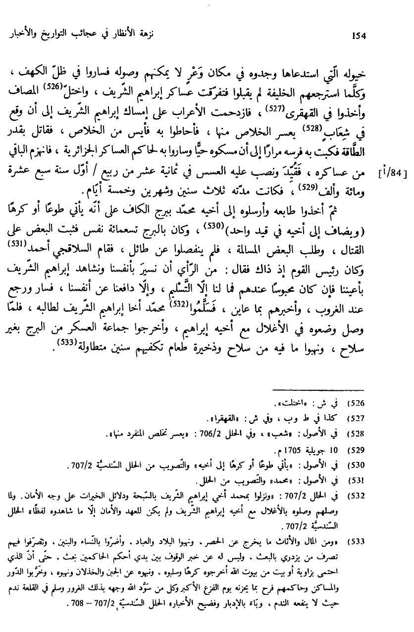 (¬532) في الحلل 2/ 707: «ونزلوا بمحمد أخي إبراهيم الشّريف بالسّبحة ودلائل الخيرات على وجه الأمان. ولما وصلهم وصلوه بالأغلال مع أخيه إبراهيم الشّريف ولم يكن للعهد والأمان إلاّ ما شاهدوه لفظا» الحلل السّندسيّة 2/ 707.