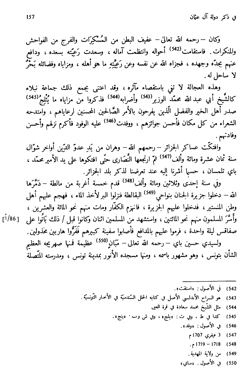 وكان - رحمه الله تعالى - عفيف البطن من المسكرات والفرج من الفواحش والمنكرات. فاستقامت (¬542) أحواله وانتظمت آماله، وسعدت رعيّته بسعده، ودافع عنهم بجدّه وجهده، فجزاه الله عن نفسه وعن رعيّته ما هو أهله، ومزاياه وفضائله بحر لا ساحل له.