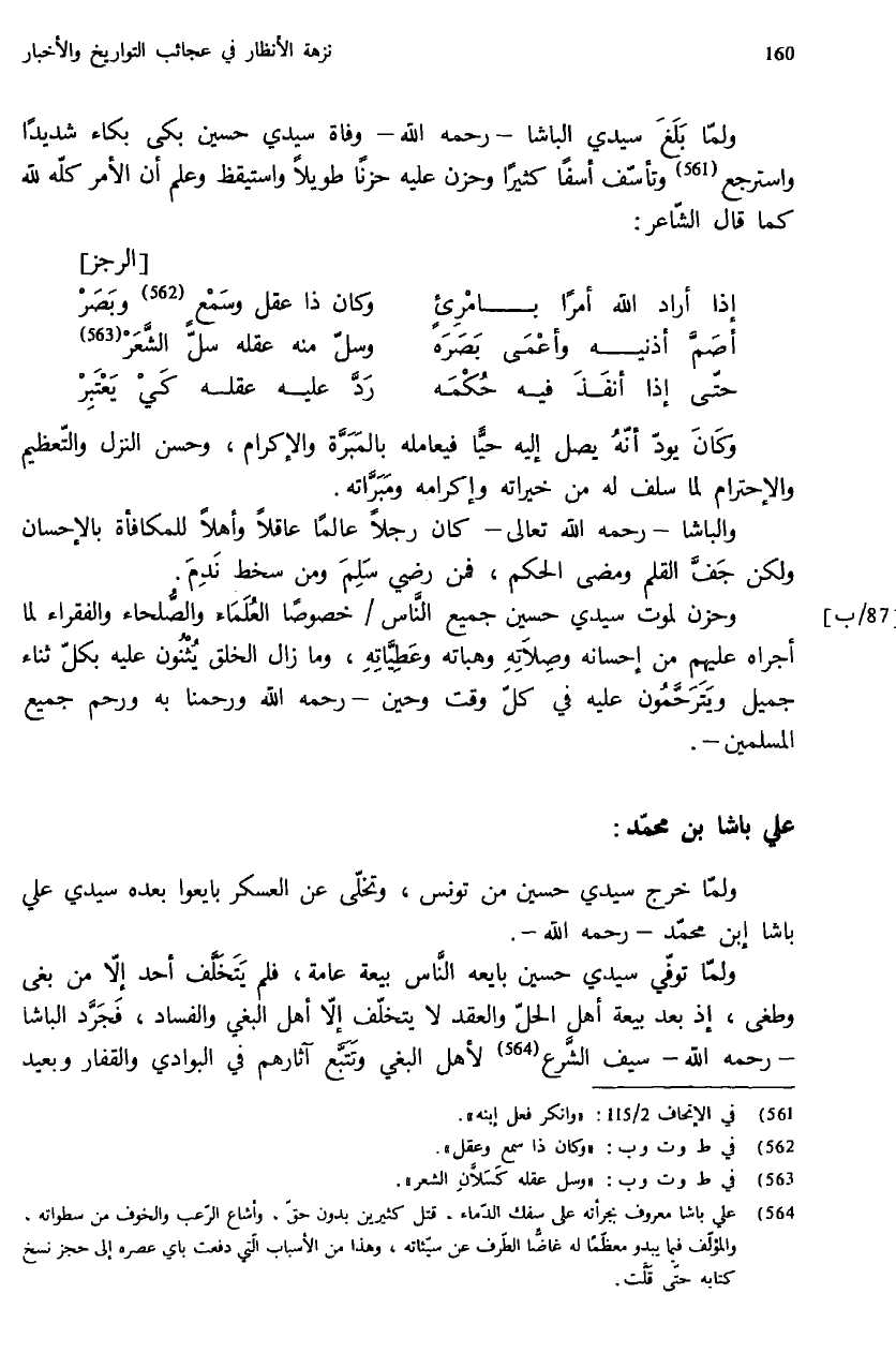 ولمّا بلغ سيدي الباشا - رحمه الله - وفاة سيدي حسين بكى بكاء شديدا واسترجع (¬561) وتأسّف أسفا كثيرا وحزن عليه حزنا طويلا واستيقظ وعلم أن الأمر كلّه لله كما قال الشّاعر: