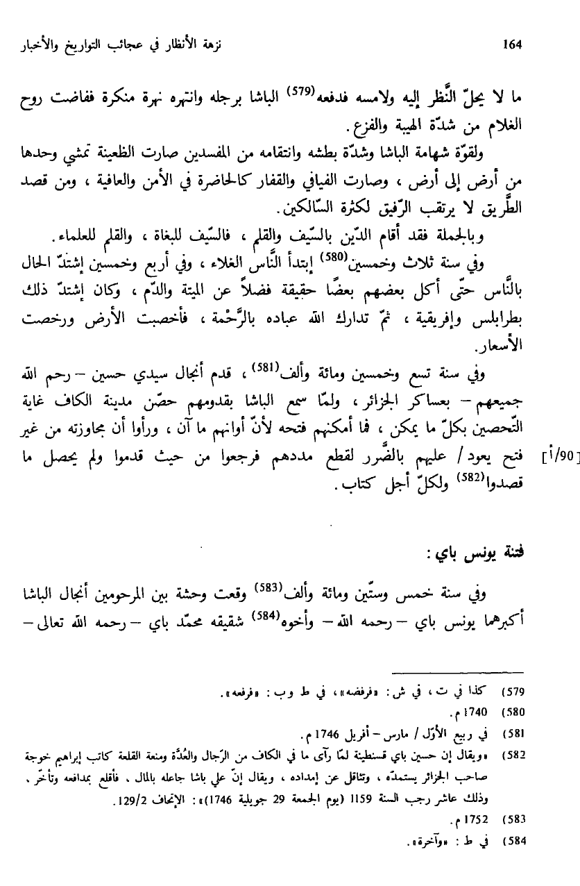 وفي سنة خمس وستّين ومائة وألف (¬583) وقعت وحشة بين المرحومين أنجال الباشا أكبرهما يونس باي - رحمه الله - وأخوه (¬584) شقيقه محمّد باي - رحمه الله تعالى -