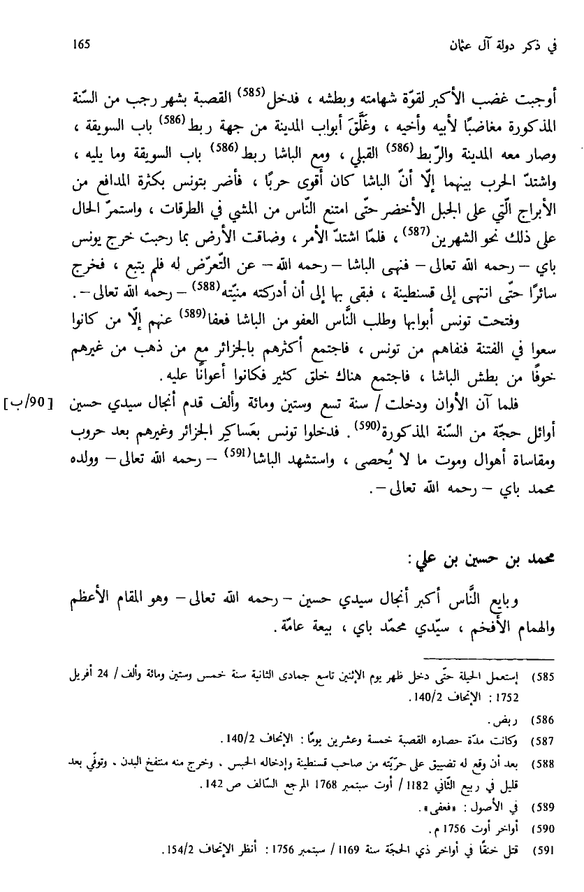 (¬585) إستعمل الحيلة حتّى دخل ظهر يوم الإثنين تاسع جمادى الثانية سنة خمس وستين ومائة وألف / 24 أفريل 1752: الإتحاف 2/ 140.