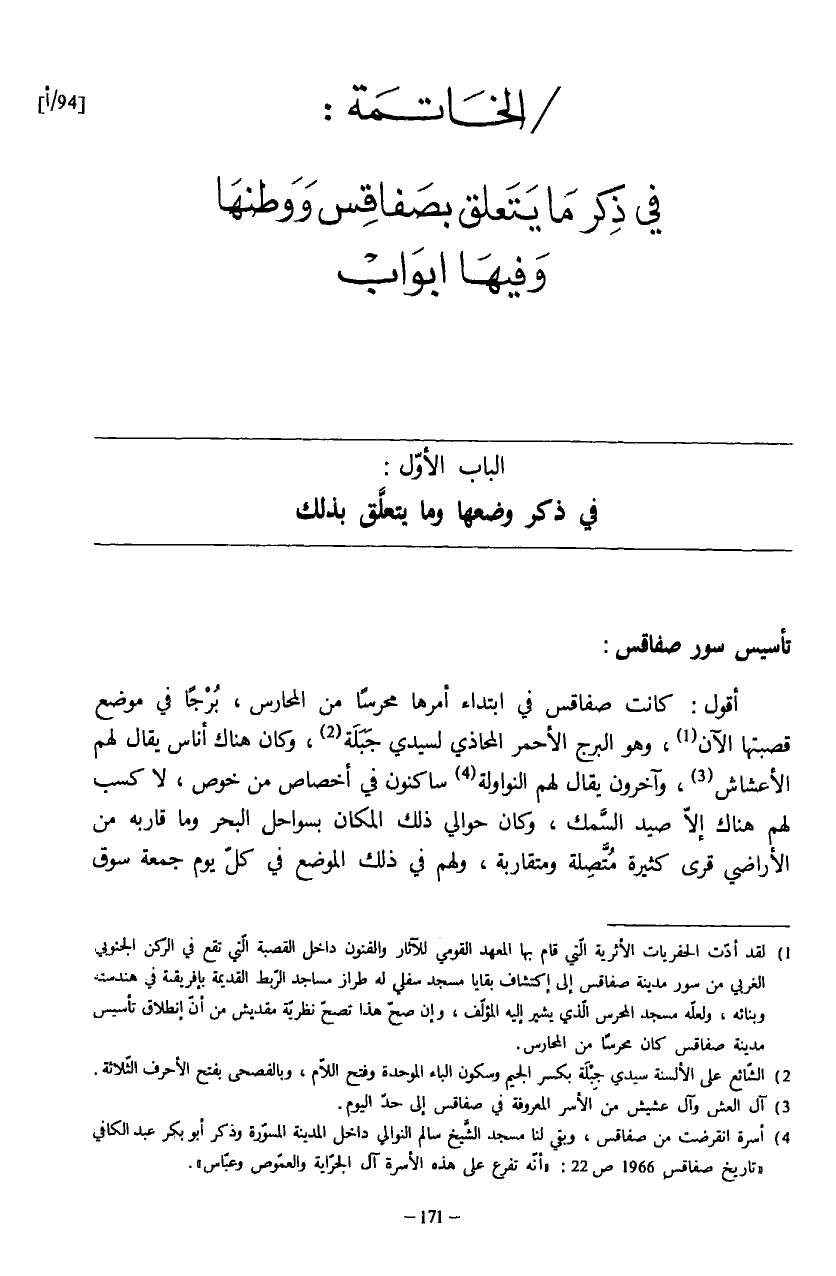 (¬1) لقد أدّت الحفريات الأثرية الّتي قام بها المعهد القومي للآثار والفنون داخل القصبة الّتي تقع في الرّكن الجنوبي الغربي من سور مدينة صفاقس إلى إكتشاف بقايا مسجد سفلي له طراز مساجد الرّبط القديمة بإفريقية في هندسته وبنائه، ولعلّه مسجد المحرس الّذي يشير إليه المؤلّف، وإن صحّ هذا تصحّ نظريّة مقديش من أنّ إنطلاق تأسيس مدينة صفاقس كان محرسا من المحارس.