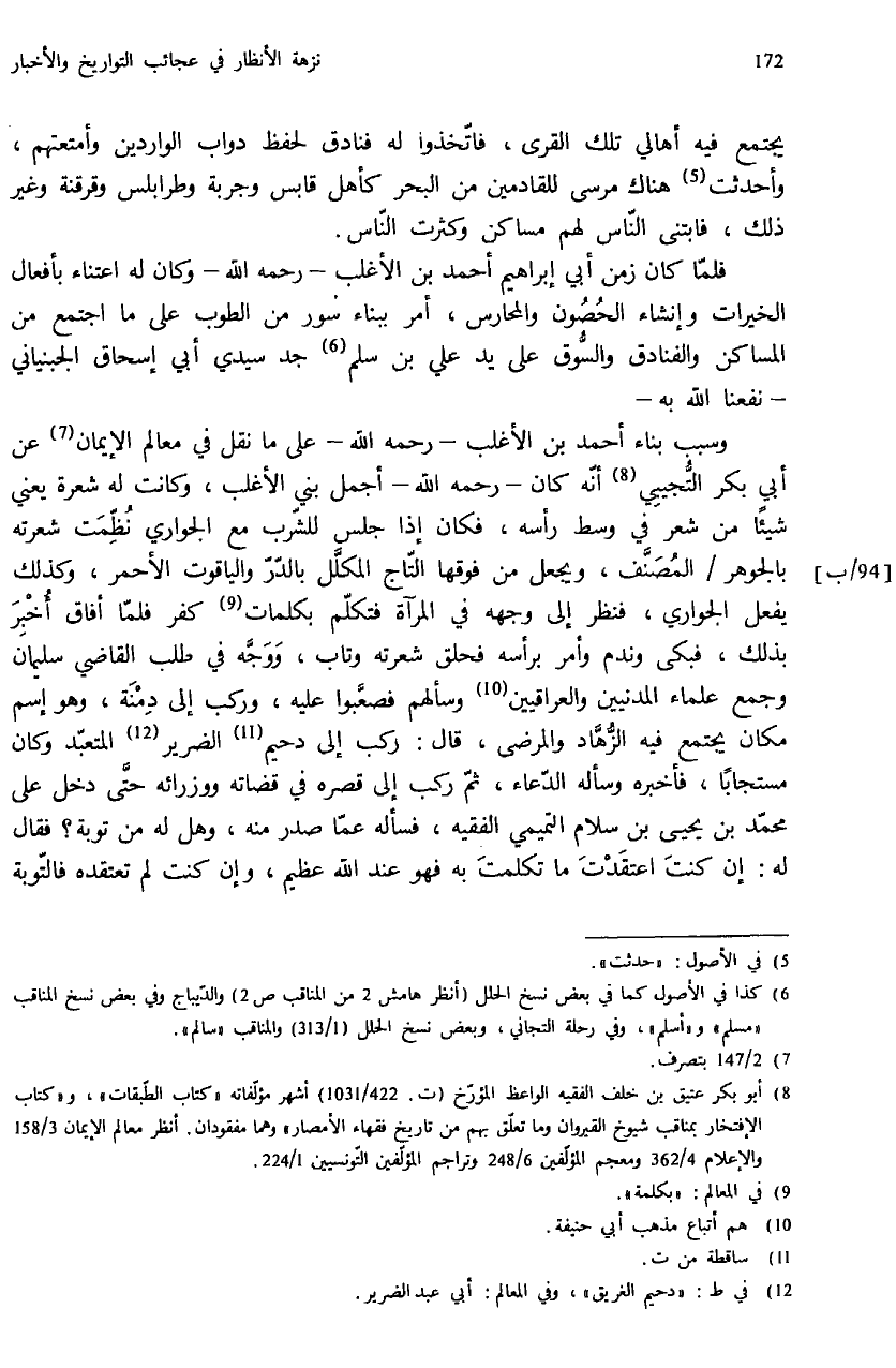 (¬8) أبو بكر عتيق بن خلف الفقيه الواعظ المؤرّخ (ت.422/ 1031) أشهر مؤلّفاته «كتاب الطّبقات»، و «كتاب الإفتخار بمناقب شيوخ القيروان وما تعلّق بهم من تاريخ فقهاء الأمصار» وهما مفقودان. أنظر معالم الإيمان 3/ 158 والإعلام 4/ 362 ومعجم المؤلّفين 6/ 248 وتراجم المؤلّفين التّونسيين 1/ 224.