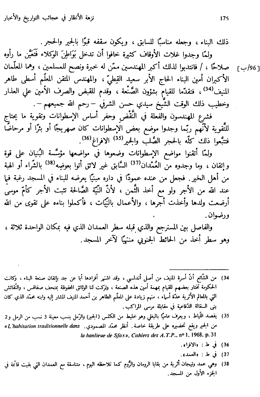 (¬35) يقصد اللّياط، ويعرف عاميا بالبغلي وهو خليط من الكلس (الجير) والرّمل بنسب معينة 3 نسب من الرمل و 2 من الجير ويقع تحضيره على طريقة خاصة. أنظر محمّد المصمودي