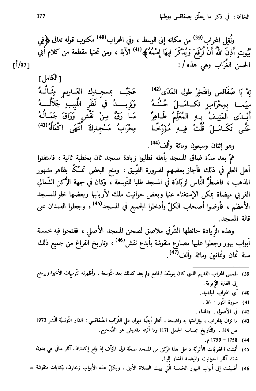 (¬43) ما تزال بالمحراب، وقراءتها به واضحة، أنظر أيضا ديوان علي الغراب الصّفاقسي: الدّار التّونسيّة للنّشر 1973 ص: 319، والتّاريخ بحساب الجمل 1171 وما أثبته مقديش هو الصّحيح.