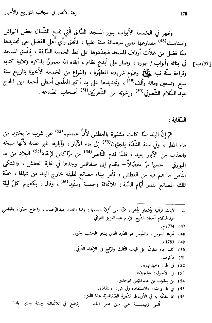 وظهر في الخمسة الأبواب بهور المسجد السّابق الّتي تفتح للشّمال بعض انهراش واستاست (¬48) مصارعها لمضي سبعمائة سنة عليها، فاتّفق رأي أهل الفضل على تجديدها ممّا فضل من غلاّت أوقاف المسجد فجدّدوها على نمط الخمسة السّابقة، فاتّسق المسجد في بنائه وأبواب / بهوره، وصار على أبدع نظام، أبقاه الله معمورا بذكره وتلاوة كتابه وقراءة سنّة نبيه صلّى الله عليه وسلم وعلوم شريعته المطهّرة، والفراغ من الخمسة الأخيرة بتاريخ سنة سبع وتسعين ومائة وألف (¬49)، وتجديدها على يد أكبر المعلّمين أسطى أحمد ابن الحاج عبد السّلام الشّعبوني (¬50) وإخوته من الشّعريّين (¬51) أصحاب الصّناعة.