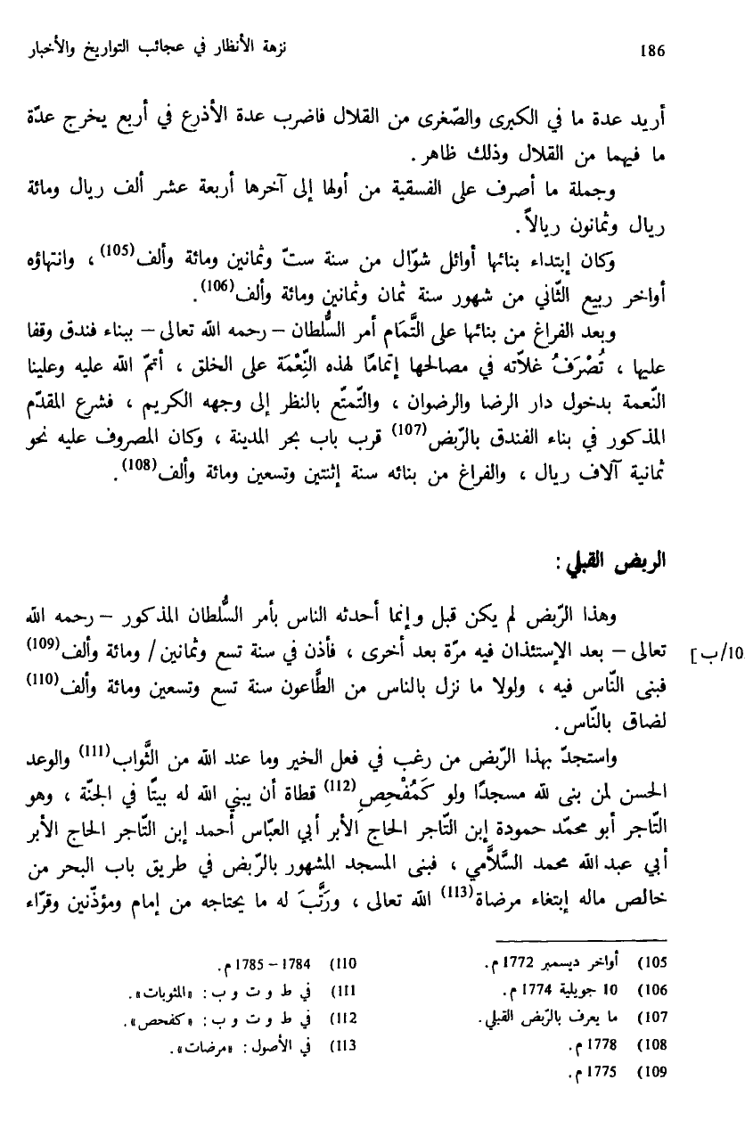 وهذا الرّبض لم يكن قبل وإنما أحدثه الناس بأمر السّلطان المذكور - رحمه الله تعالى - بعد الإستئذان فيه مرّة بعد أخرى، فأذن في سنة تسع وثمانين / ومائة وألف (¬109) فبنى النّاس فيه، ولولا ما نزل بالناس من الطّاعون سنة تسع وتسعين ومائة وألف (¬110) لضاق بالنّاس.