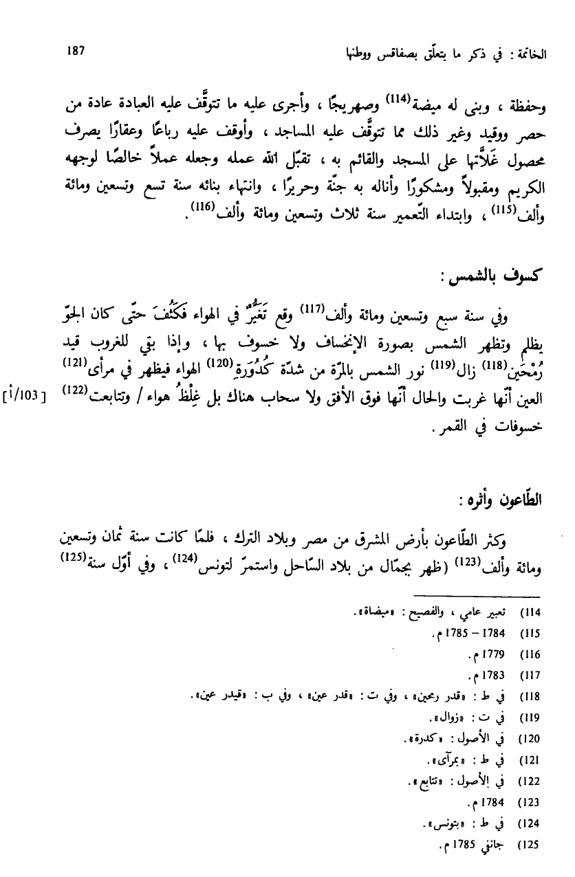 وفي سنة سبع وتسعين ومائة وألف (¬117) وقع تغيّر في الهواء فكثف حتّى كان الجوّ يظلم وتظهر الشمس بصورة الإنخساف ولا خسوف بها، وإذا بقي للغروب قيد رمحين (¬118) زال (¬119) نور الشمس بالمرّة من شدّة كدورة (¬120) الهواء فيظهر في مرأى (¬121) العين أنّها غربت والحال أنّها فوق الأفق ولا سحاب هناك بل غلظ هواء / وتتابعت (¬122) خسوفات في القمر.